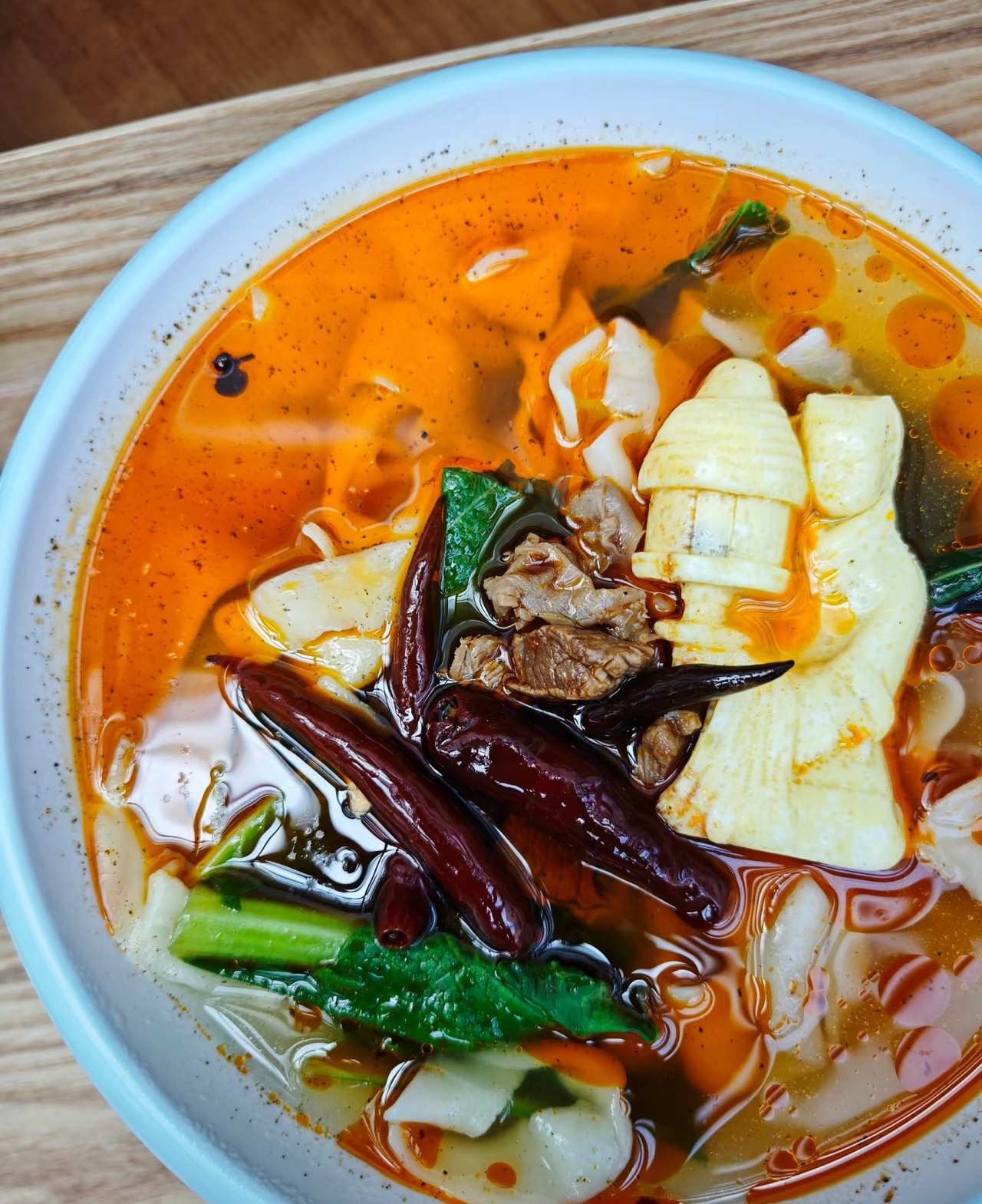 半小时后,在负一楼餐厅,点餐窗口已排起十余人的队伍。不少游客直奔主题:“一份长信宫灯板面!”几分钟后,一碗刚出锅的面被端上桌——以蒸蛋为材料制作的“长信宫灯”,搭配特色牛肉板面,热气袅袅升起。汪鸿举起手机,记录下这碗“可以吃的文物”。