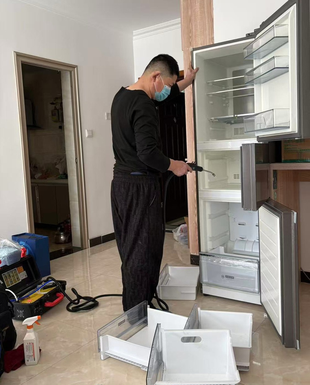 张师傅正在用高温蒸汽清洗设备清洗冰箱