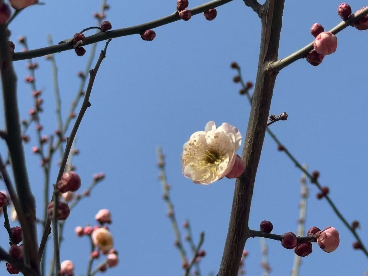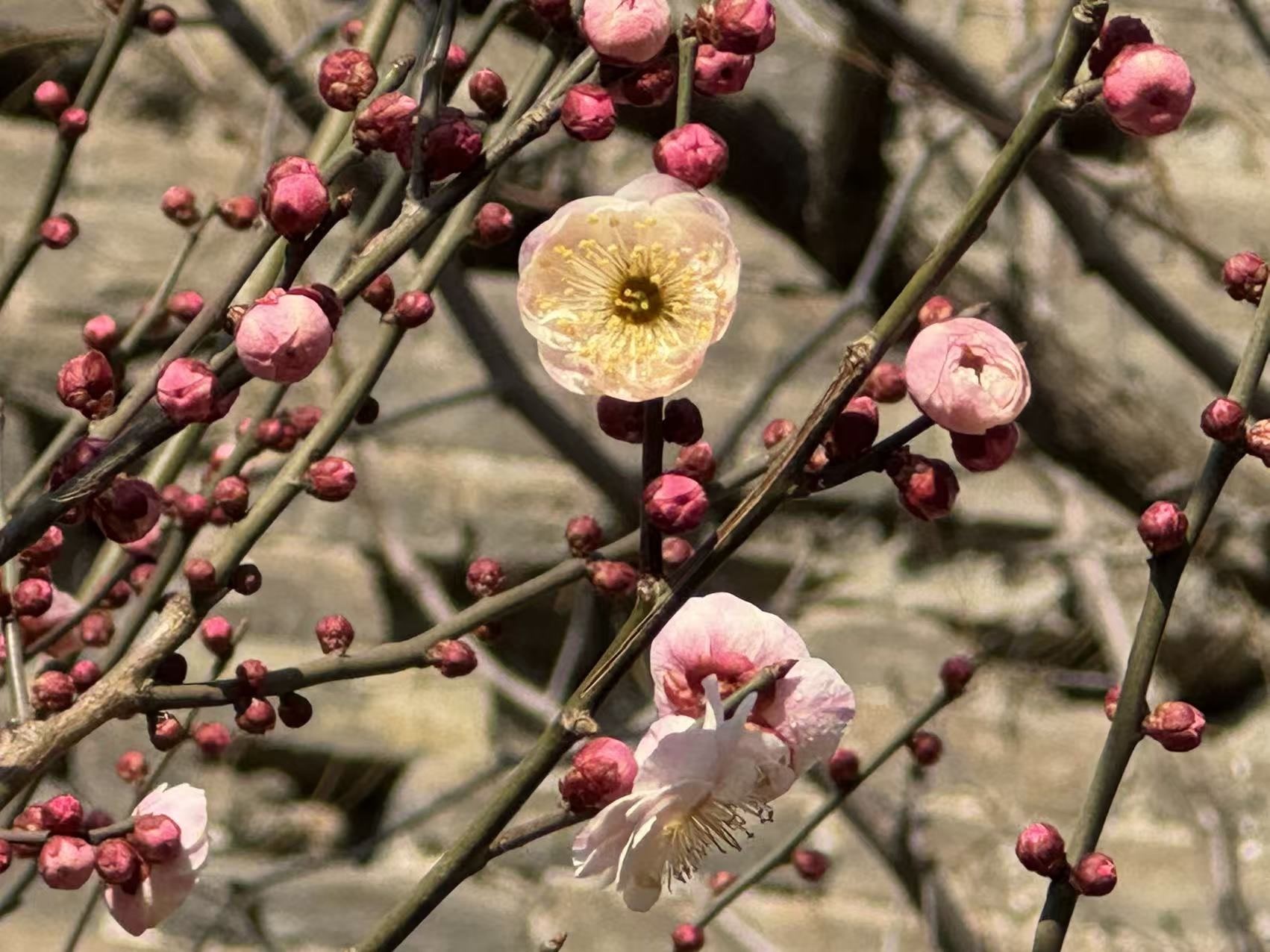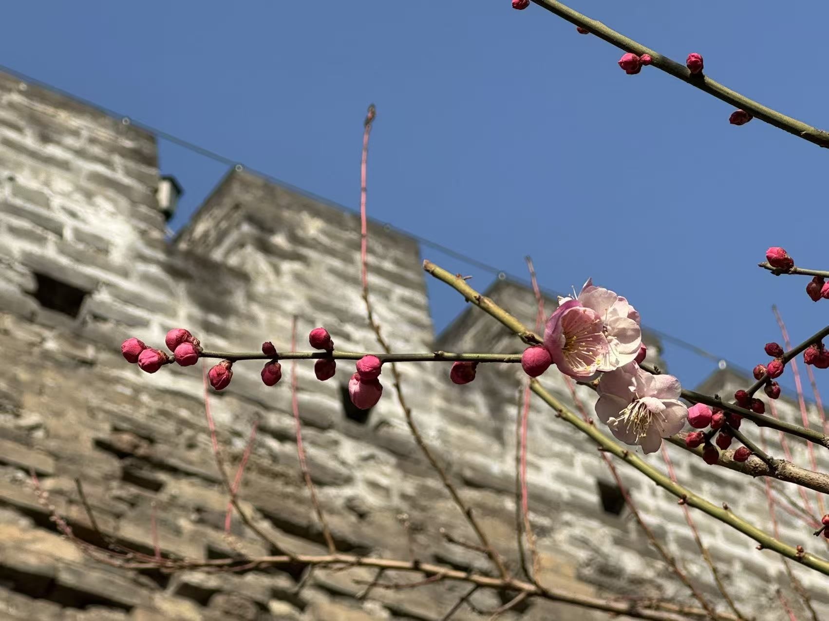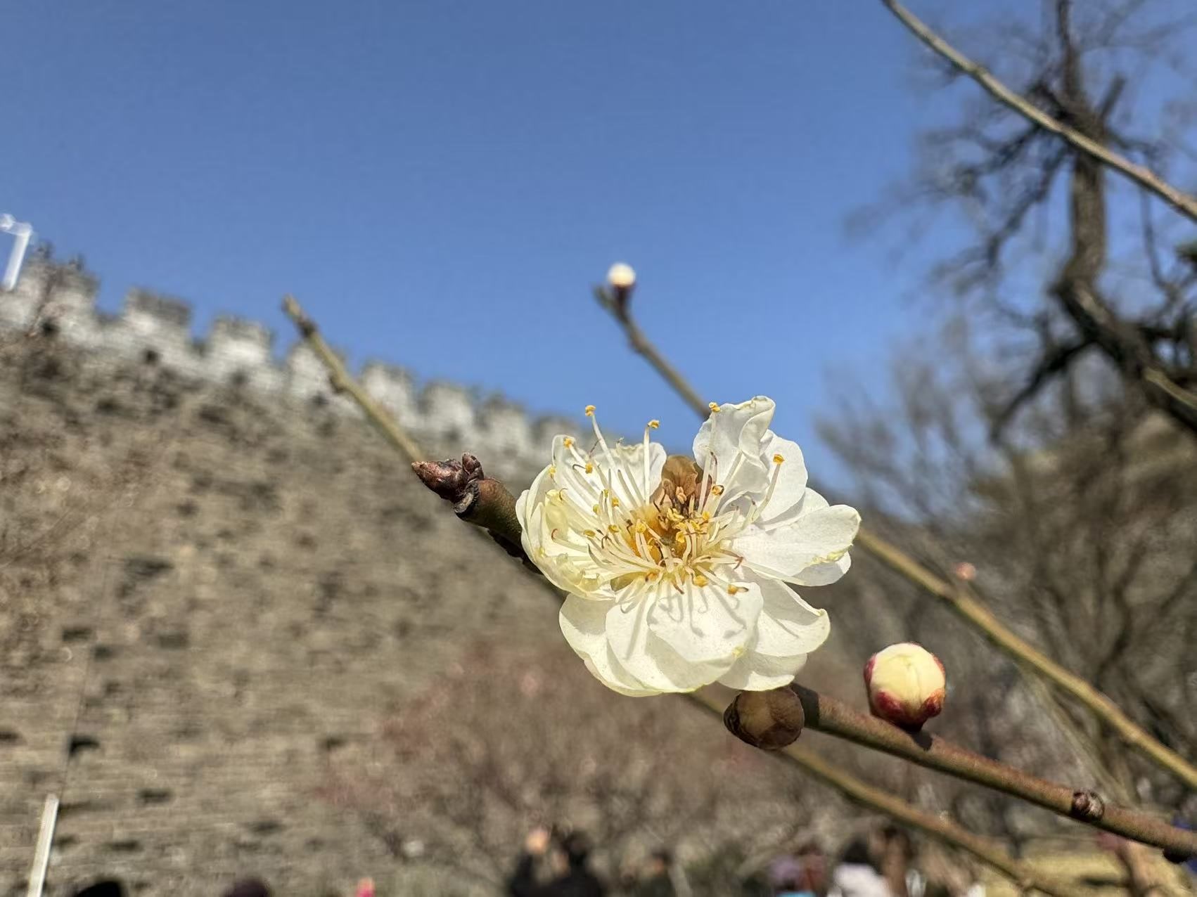 除了金黄和洁白之外,粉色浪漫也已来袭。在明城墙遗址公园南门旁,五六株提早盛开的粉色和白色梅花,吸引了不少市民游客前来欣赏。“白色的是北京玉蝶梅,粉色的多为宫粉梅或朱砂梅。” 公园工作人员介绍,这几株梅花是园内每年最早开放的品种。