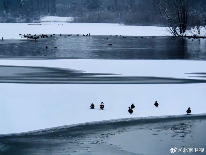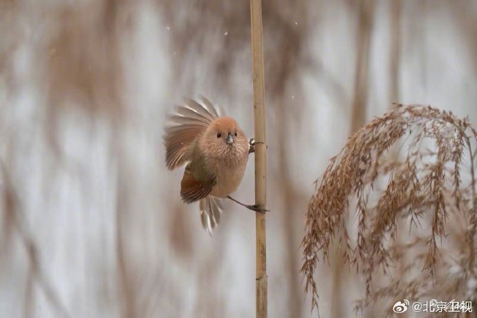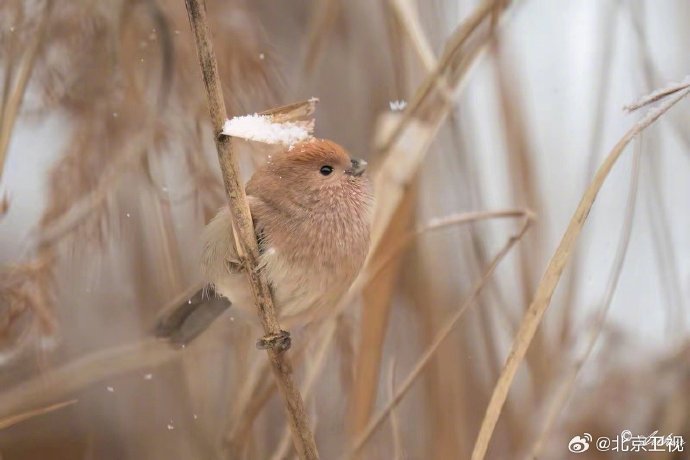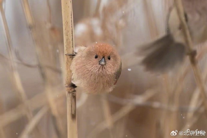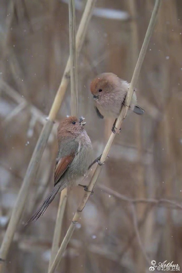#雪后翠湖是毛团子的水墨乐园# 雪霁初晴,翠湖国家城市湿地公园变身静谧水墨画卷。除了冰面伫立的绿头鸭与鸿雁,最惹人爱的莫过于芦苇丛中那些圆滚滚的“毛团子”棕头鸦雀,正专心赏雪,灵动可爱。#北京原来可以这么美#