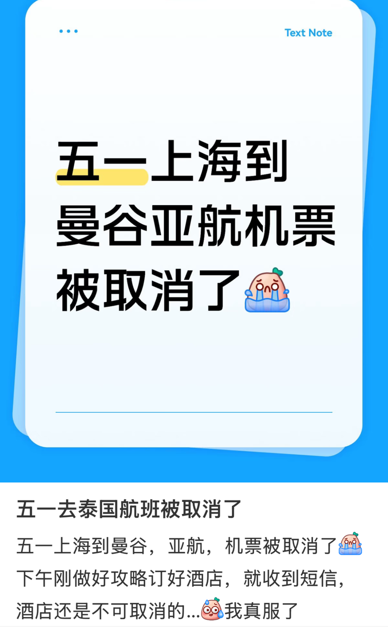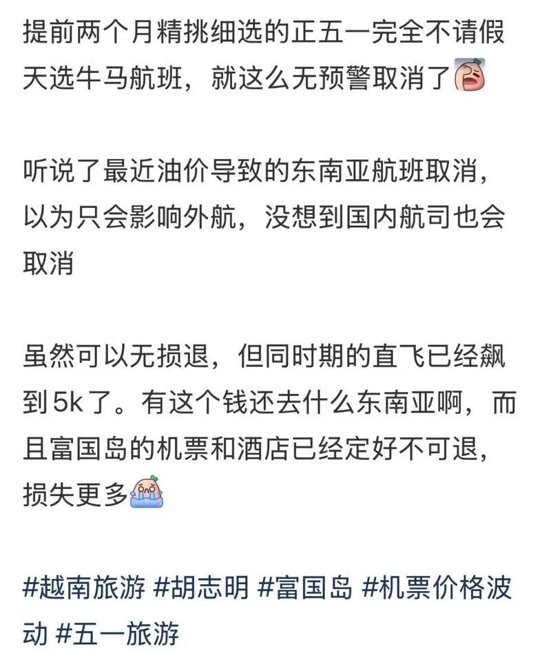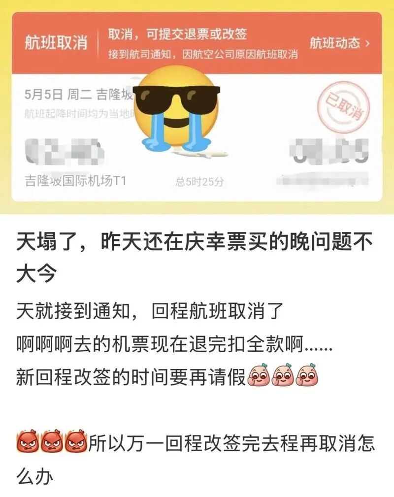 最近,在多个社交平台上,有不少网友发帖称,自己提前预订好的“五一”假期出游国际航班被临时取消,主要集中在东南亚和大洋洲地区。航班取消后,再购买新机票要么需要加价,要么出行日期不合适,提前订好的酒店和景点门票也难以退款,面临一系列损失。