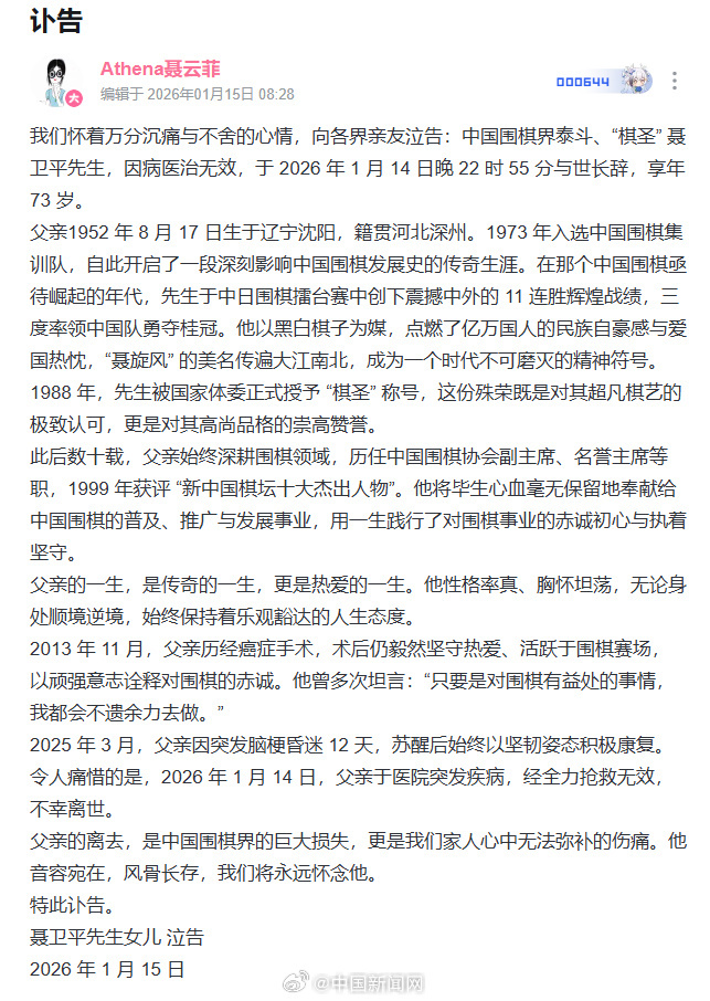 中国围棋协会名誉主席、“棋圣”聂卫平九段昨晚在北京病逝。15日,聂卫平女儿聂云菲发布讣告。