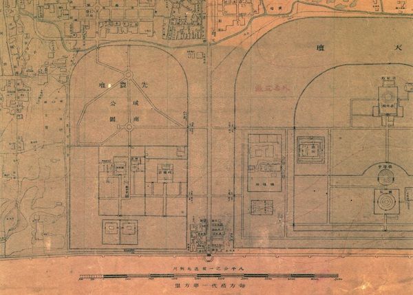 1917年京都市政公所绘制《京都市内外城地图》,中宣武门外先农坛附近的城南游艺园方位