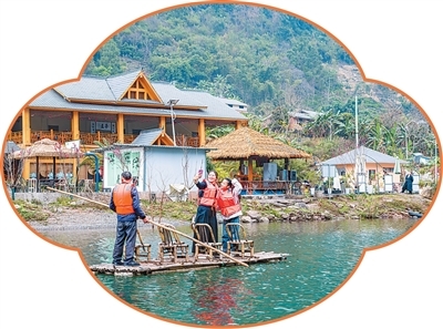 云南昭通市绥江县南岸村,游客乘竹筏游览山水美景。曾三东摄
