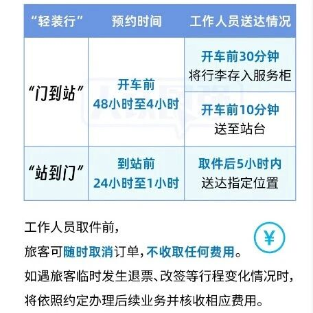 “轻装行”是铁路部门为旅客出行提供的“门到站”“站到门”同城行李搬运服务。在同城距离车站35公里内,旅客根据实际需要可选择以下两种“轻装行”服务: