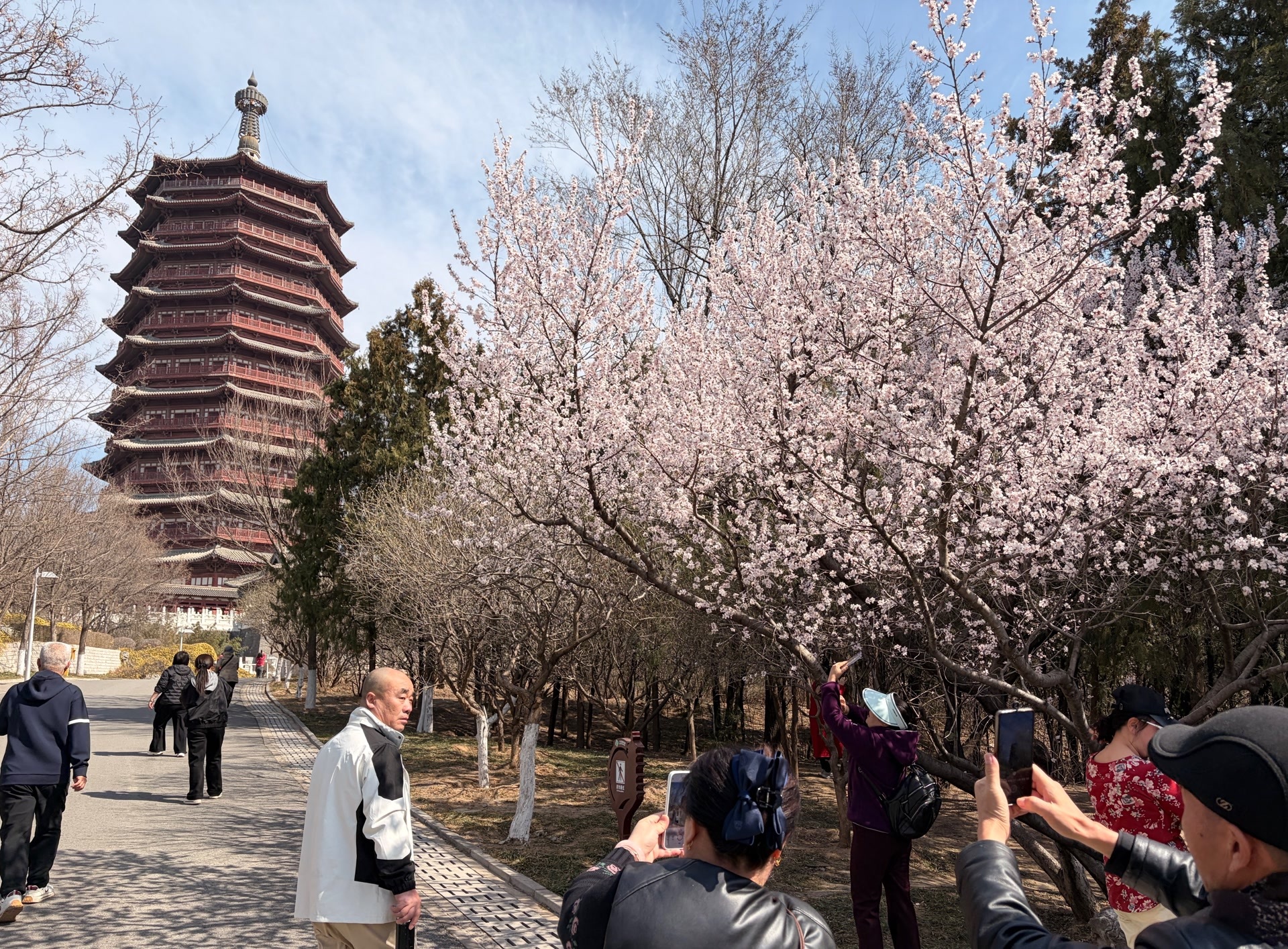 行走在鹰山蜿蜒的山道中,两侧的山桃花娇俏灵动,肆意舒展。游人们或漫步其间,或驻足拍照打卡,人与自然相谐,是春日最动人的模样。登上永定塔,四望是苍翠的松柏、遒劲的枝丫和如云霞的山桃花,远处是波光粼粼的永定河,宛若一幅大自然随手绘就的山水画。