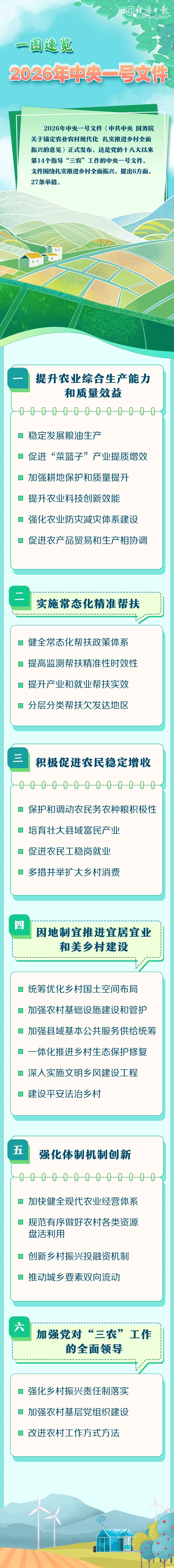 2026年中央一号文件《中共中央国务院关于锚定农业农村现代化扎实推进乡村全面振兴的意见》正式发布,这是党的十八大以来第14个指导“三农”工作的中央一号文件。文件围绕扎实推进乡村全面振兴,提出6方面、27条举措。