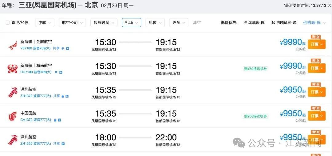 三亚飞北上广深机票逼近万元,官方出手_北京时间