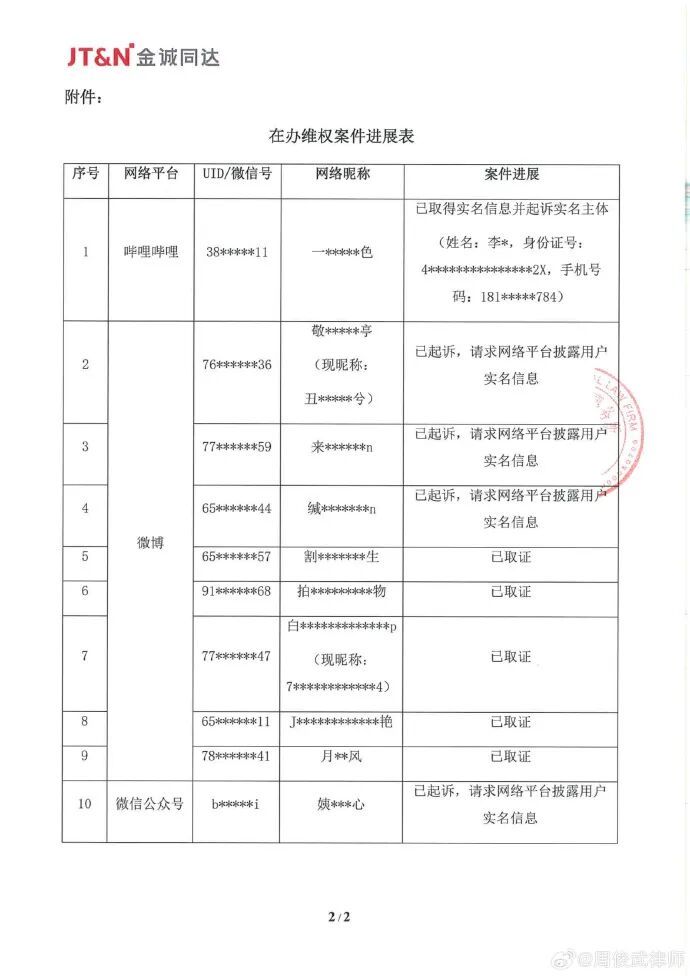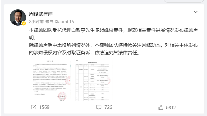 此外,代理律师还表示:除律师声明中表格所列情况外,本律师团队将持续关注网络动态,对相关主体发布的涉嫌侵权内容及时取证备诉,依法追究其法律责任。