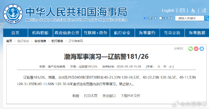 据中国海事局网站消息,葫芦岛海事局发布航行警告,4月29日4时至7时30分,渤海部分海域进行军事演习,禁止驶入。