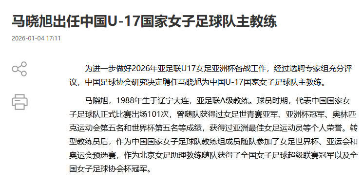 中国足协在公告中说:“为进一步做好2026年亚足联U17女足亚洲杯备战工作,经过选聘专家组充分评议,中国足球协会研究决定聘任马晓旭为中国U17国家女子足球队主教练。”