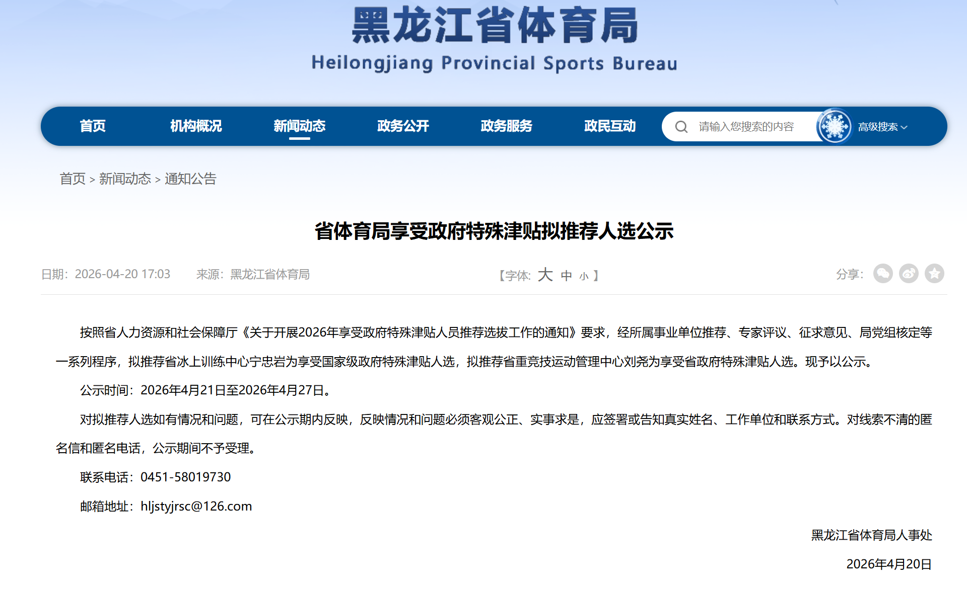 4月20日,黑龙江省体育局官方网站发布《省体育局享受政府特殊津贴拟推荐人选公示》。