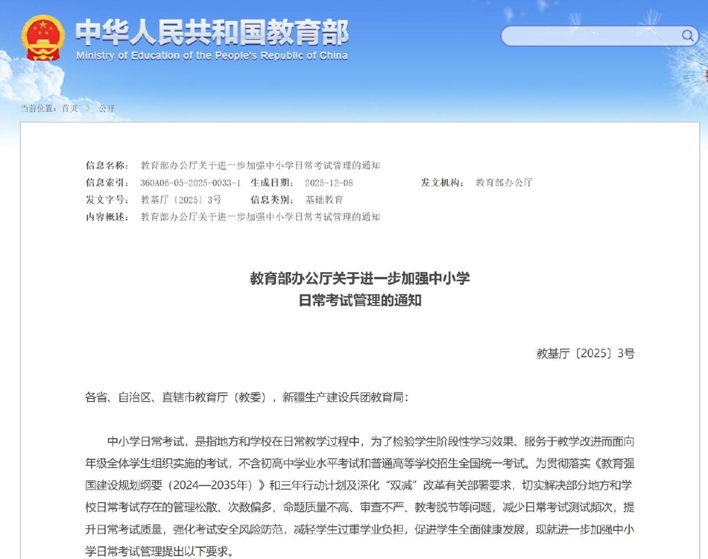 12月4日,教育部办公厅发布了《教育部办公厅关于进一步加强中小学日常考试管理的通知》(以下简称《通知》),为解决部分地方和学校日常考试存在的管理松散、次数偏多、命题质量不高、审查不严、教考脱节等问题,减少日常考试测试频次,提升日常考试质量,强化考试安全风险防范,减轻学生过重学业负担,促进学生全面健康发展,提出进一步加强中小学日常考试管理要求。