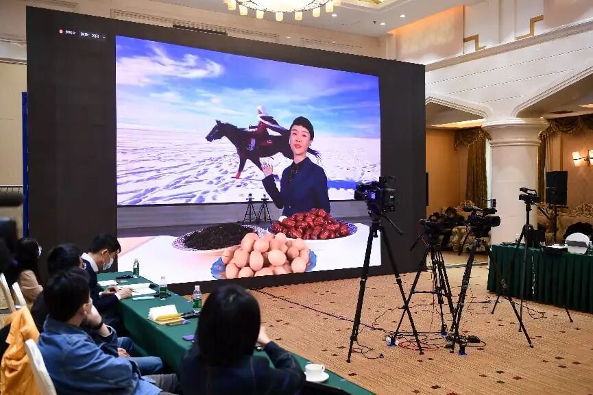 2022年3月17日,新疆维吾尔自治区人民政府在北京举办涉疆新闻发布会,并在会上视频连线贺娇龙,请她介绍带领民众通过直播带货增收的情况。 中新社记者 田雨昊 摄