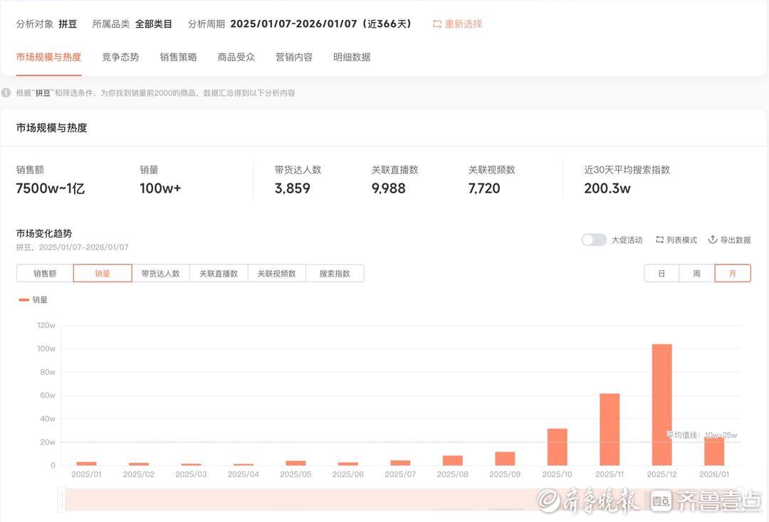 淘宝发布的《2025年度十大商品》中,拼豆也名列其中,近一年搜索量同比增长近500%。蝉妈妈数据也显示,自2025年8月起,拼豆相关产品销量持续增长,近一年销售额已突破7500万元,累计销量超100万单。有机构预测,2026年拼豆市场规模有望接近10亿元。