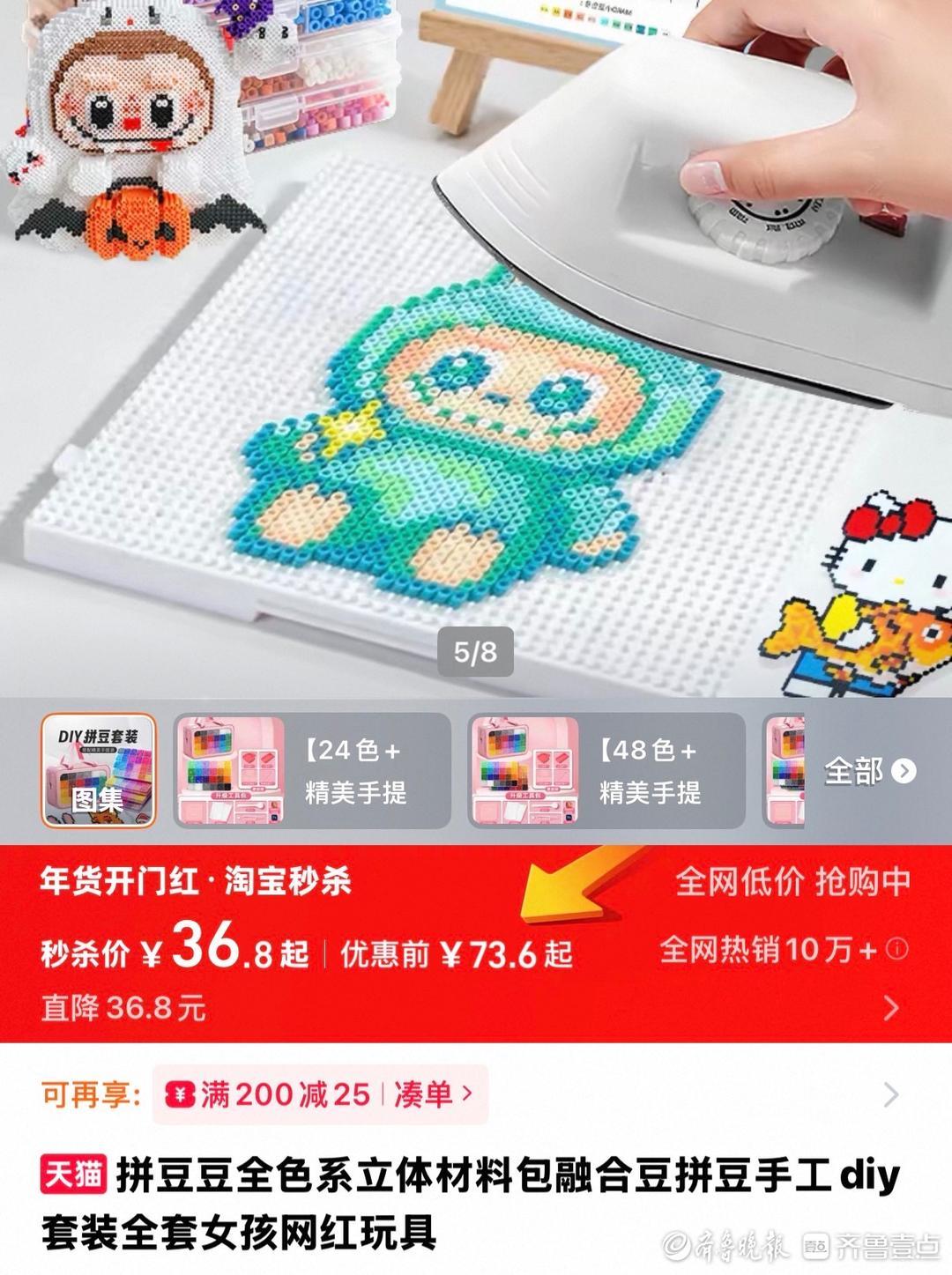 随着关注度的攀升,不少从线下体验“入坑”的爱好者,开始转向线上采购材料。记者在电商平台搜索发现,拼豆豆子价格多在每千颗1.3元至6元之间,多款材料包月销量突破10万件,部分热门单品日销超500单。除豆子外,豆盘、熨斗、豆笔等配套工具也同步走俏,销量表现亮眼。