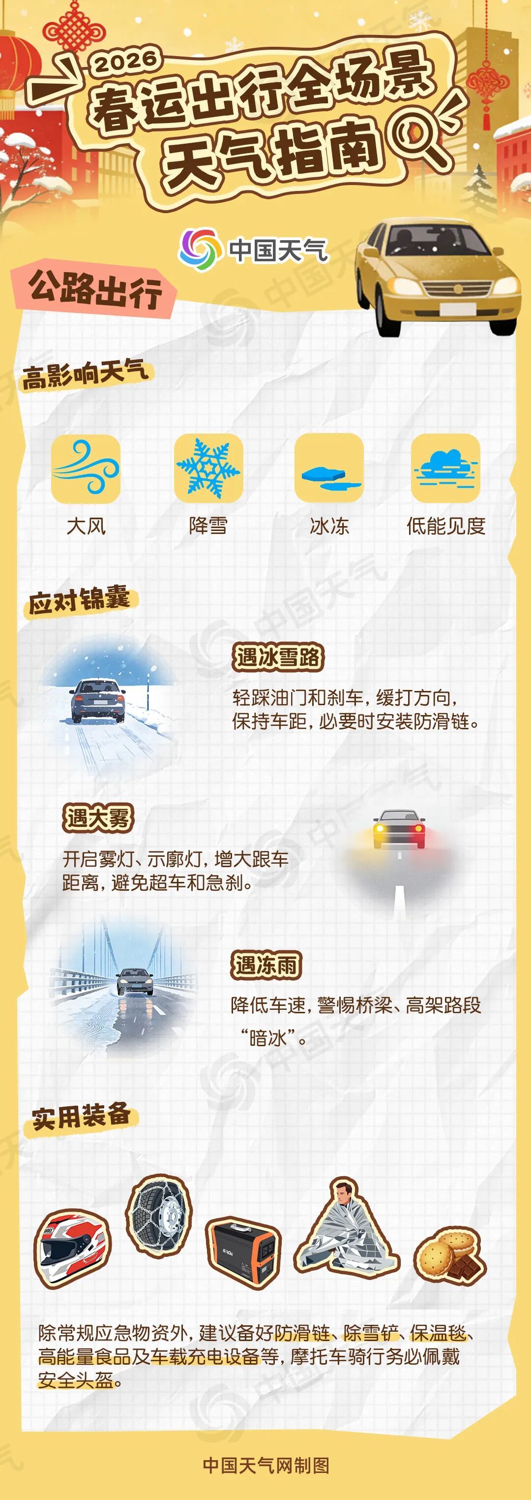一年一度的春运大幕即将开启,无论你选择公路、铁路、航空、水路哪一种方式归乡或远行,天气都是影响旅途顺畅与安全的重要因素之一。除了常规应急物资外,建议长途出行备好防滑链、除雪铲、保温毯、高能量食品及车载充电设备等,以备不时之需。