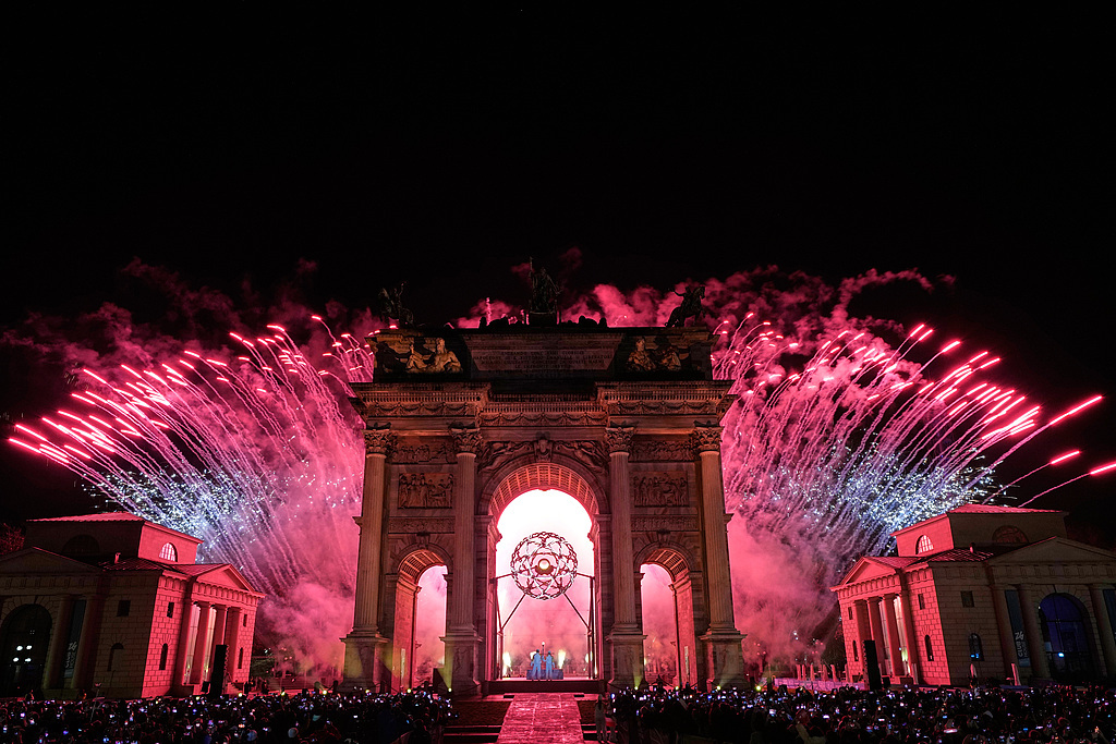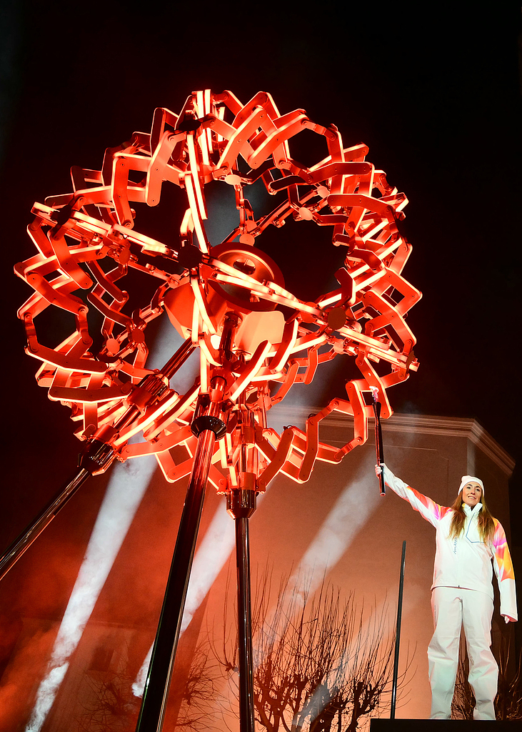 ↑主火炬在米兰和平拱门和科尔蒂纳迪博纳广场同步点燃。