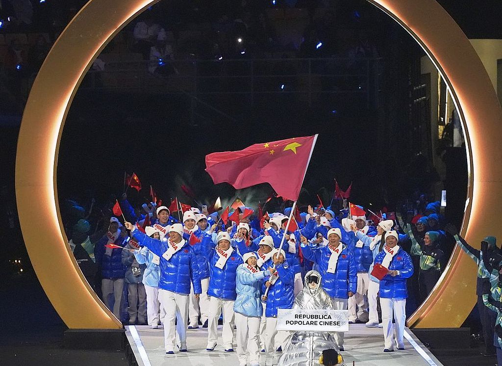 当地时间2月6日晚,2026年米兰—科尔蒂纳冬奥会正式拉开大幕。开幕式上,中国体育代表团入场。