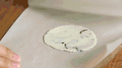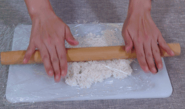 处理米饭:案板上铺上一层保鲜膜,将米饭扣在上面再铺一层保鲜膜;用擀面杖将米饭压平厚度约1-2毫米。撕掉上层保鲜膜,杯子蘸水扣在米饭上,压出圆形米饼。