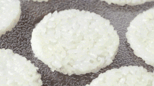 烤制:烤箱米饼放入烤盘,在烤箱中170度烤制10分钟,将米饼表面水分烤干。