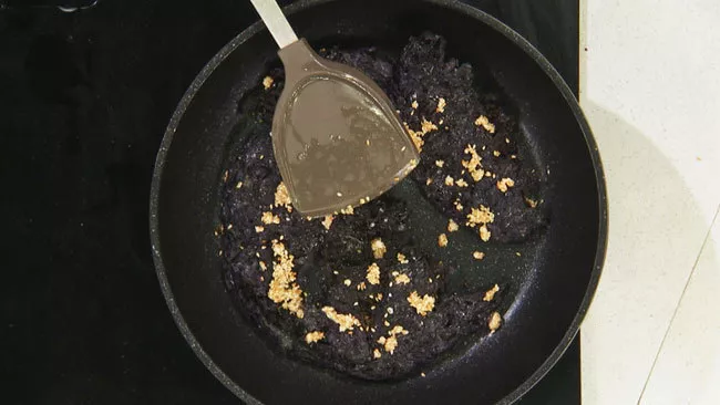 裹芝麻:白芝麻跟淀粉水拌匀后涂在干紫菜另一面,翻面煎至白芝麻金黄。