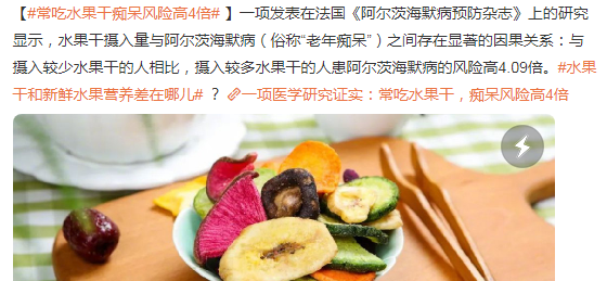 而且暖暖之前看到一条令人震惊的消息:有研究发现,摄入较多水果干,会使老年痴呆风险高4倍!