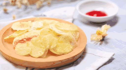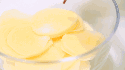 加热:土豆片平铺在盘中,不要叠着放,放入微波炉高火加热4分钟取出,将土豆片翻面,再次放入微波炉高火加热1分钟,就完成啦~