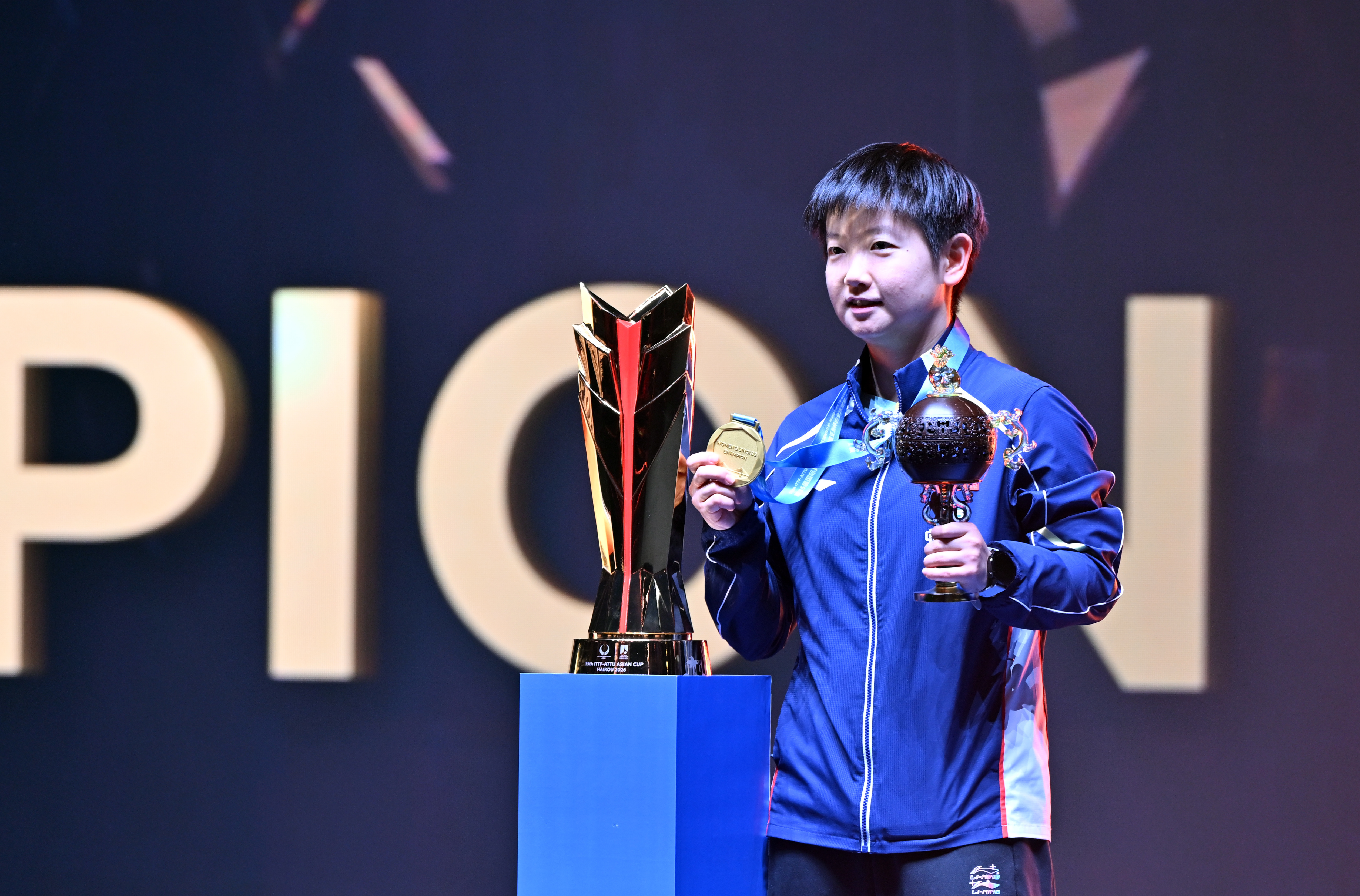 8日晚,海口五源河体育馆亮如白昼,灯光照向球台,也照亮了孙颖莎从未触及的亚洲杯女单冠军奖杯。