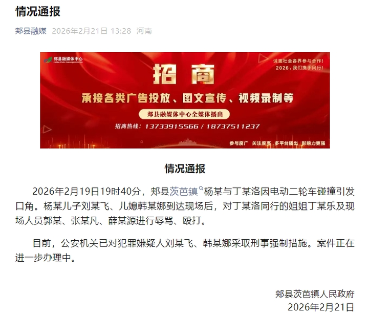 通报称,2月19日19时40分,郏县茨芭镇杨某与丁某洛因电动二轮车碰撞引发口角。杨某儿子刘某飞、儿媳韩某娜到达现场后,对丁某洛同行的姐姐丁某乐及现场人员郭某、张某凡、薛某源进行辱骂、殴打。目前,公安机关已对犯罪嫌疑人刘某飞、韩某娜采取刑事强制措施。