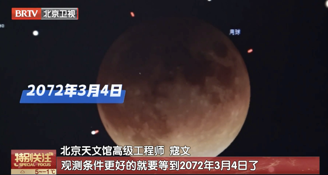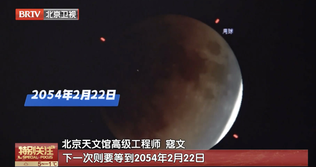 北京天文馆高级工程师 寇文:每年月食最多也就是发生3次,最少一次也没有。这次正好赶上正月十五,其实这个就尤其显得罕见了,你往前查大概2007年、2008年出现过,往后要到2054年才会再赶上一次月食发生在正月十五,但是可惜那一次咱们国家看不到,真正能够看到下一次元宵节的月全食要等到2072年。