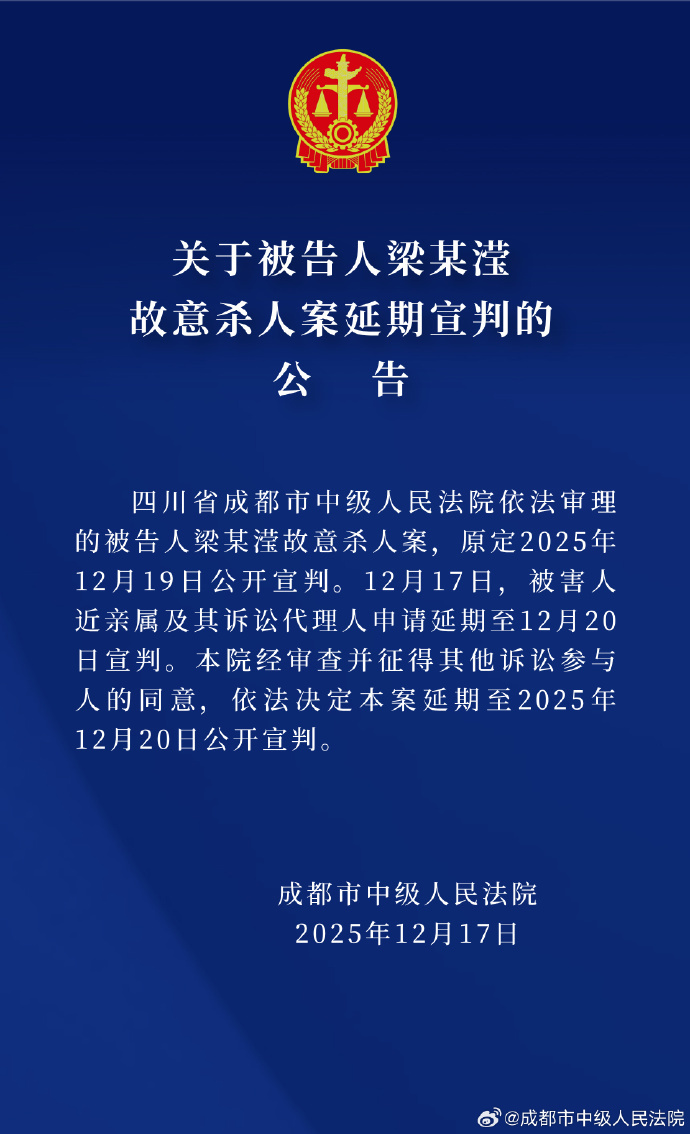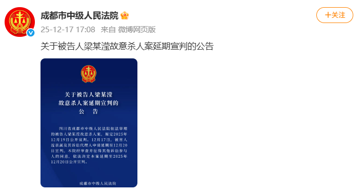 四川省成都市中级人民法院官方微博截图 成都市中级人民法院12月17日发布《关于被告人梁某滢故意杀人案延期宣判的公告...