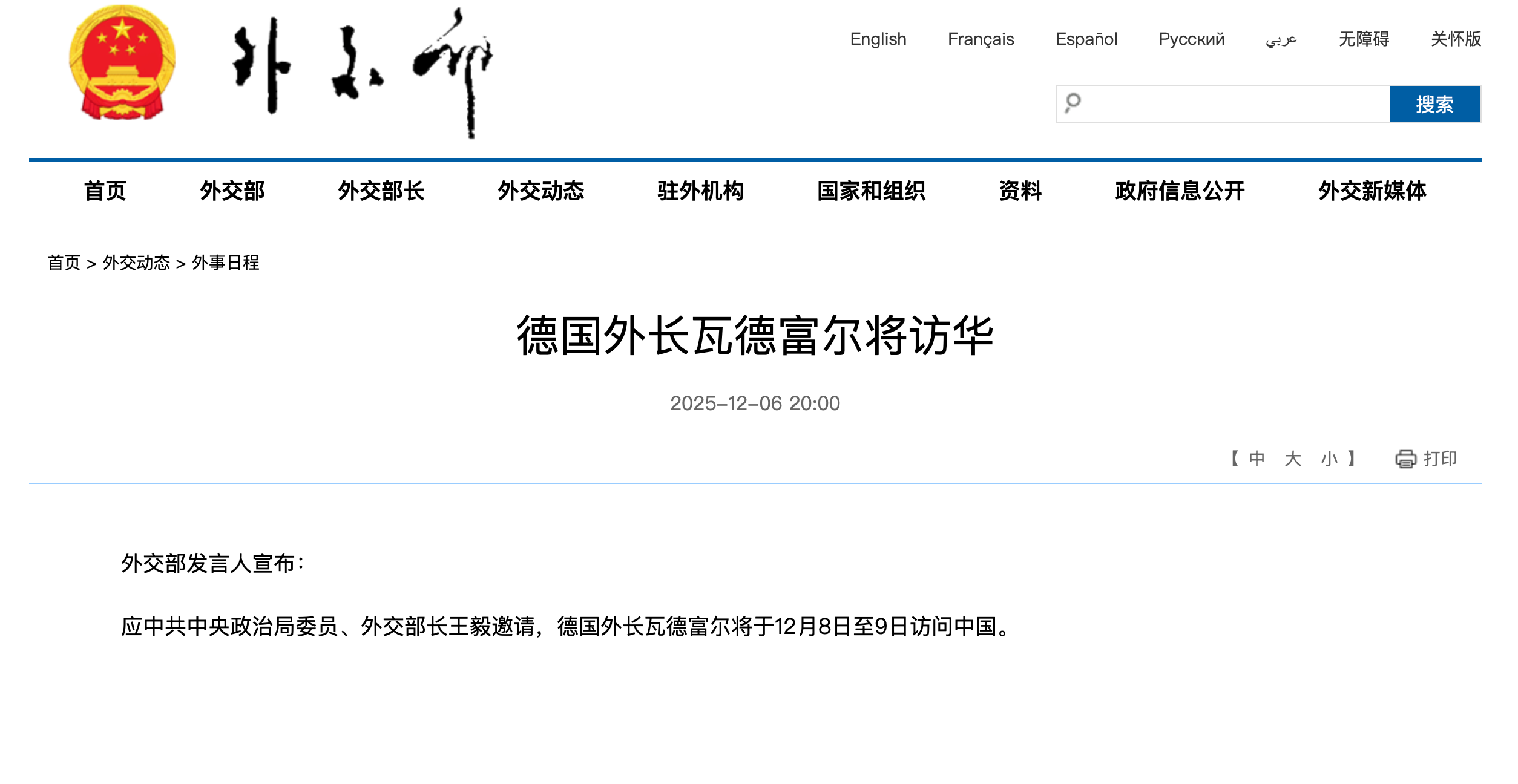 应中共中央政治局委员、外交部长王毅邀请,德国外长瓦德富尔将于12月8日至9日访问中国。