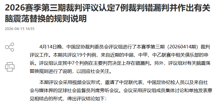 4月15日,中国足协裁判委员会评议组公布了本赛季第三期(20260414期)裁判评议工作。本期共评议19个判例,评议组认定其中7个判例在主要判罚决定上存在错漏判。