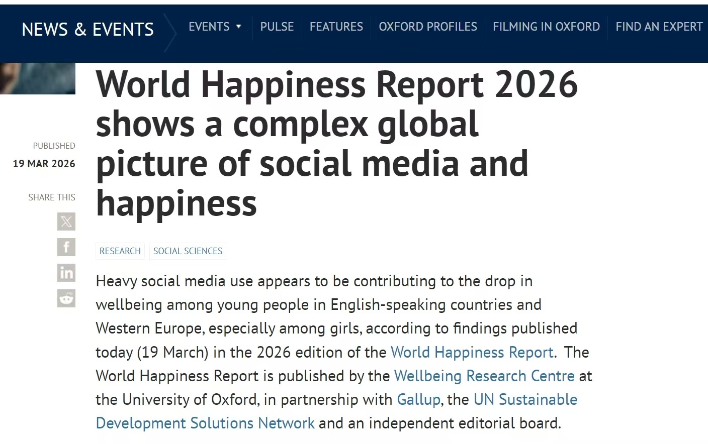 该《报告》虽未直接建立社交媒体使用与幸福感下降的因果关系,但研究人员将盖洛普数据与经合组织国际学生评估项目(PISA)等研究结果相结合后发现,过度使用社交媒体似乎会降低人们的幸福感。