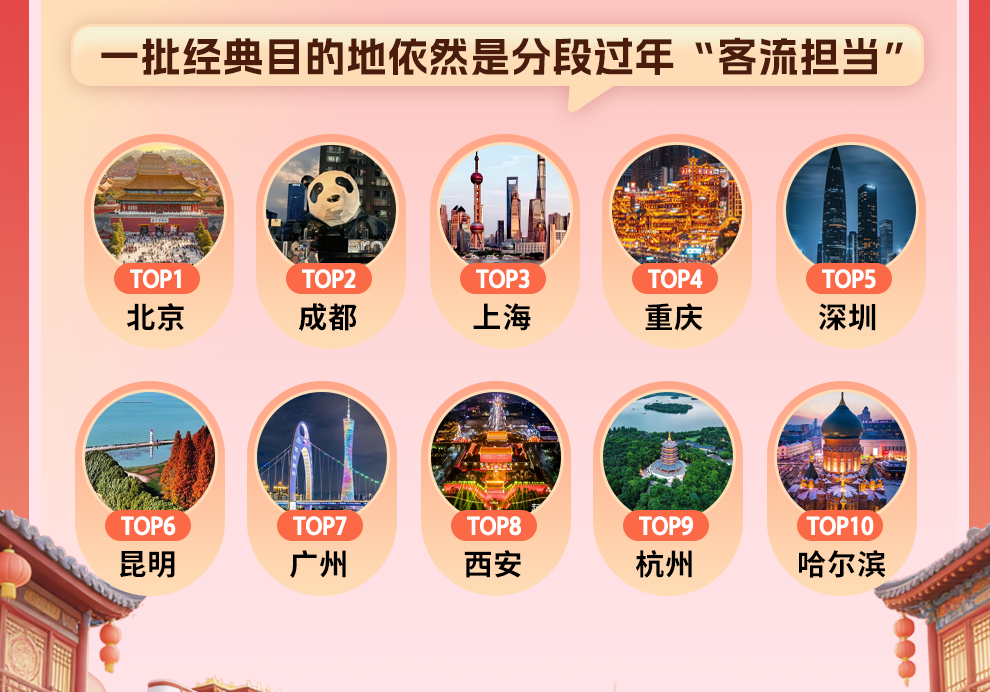 同程旅行数据还显示,今年春节假期,尽管有一些新兴目的地、特色小城接连涌现,但从航空出行热度来看,北京、成都、上海、重庆、深圳、昆明、广州、西安、杭州、哈尔滨等城市依然是承载客流的主力,稳居国内前十大热门目的地榜单。