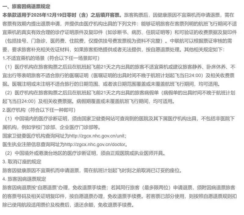 记者近日搜索发现,中国联合航空有限公司已经修改了相关规定,在“旅客须知”中写明:旅客购票后,因健康原因不宜乘机而申请退票,需在客票有效期内提出退票申请,并提供由医疗机构出具的文件。其中医疗机构已经由“国内二级甲等以上医院”改成了由“国家卫健委网站可查询到的医院及其下属医疗机构出具”。北京航空航天大学航空专家、航空知识主编王亚男表示,这样的更改值得肯定。