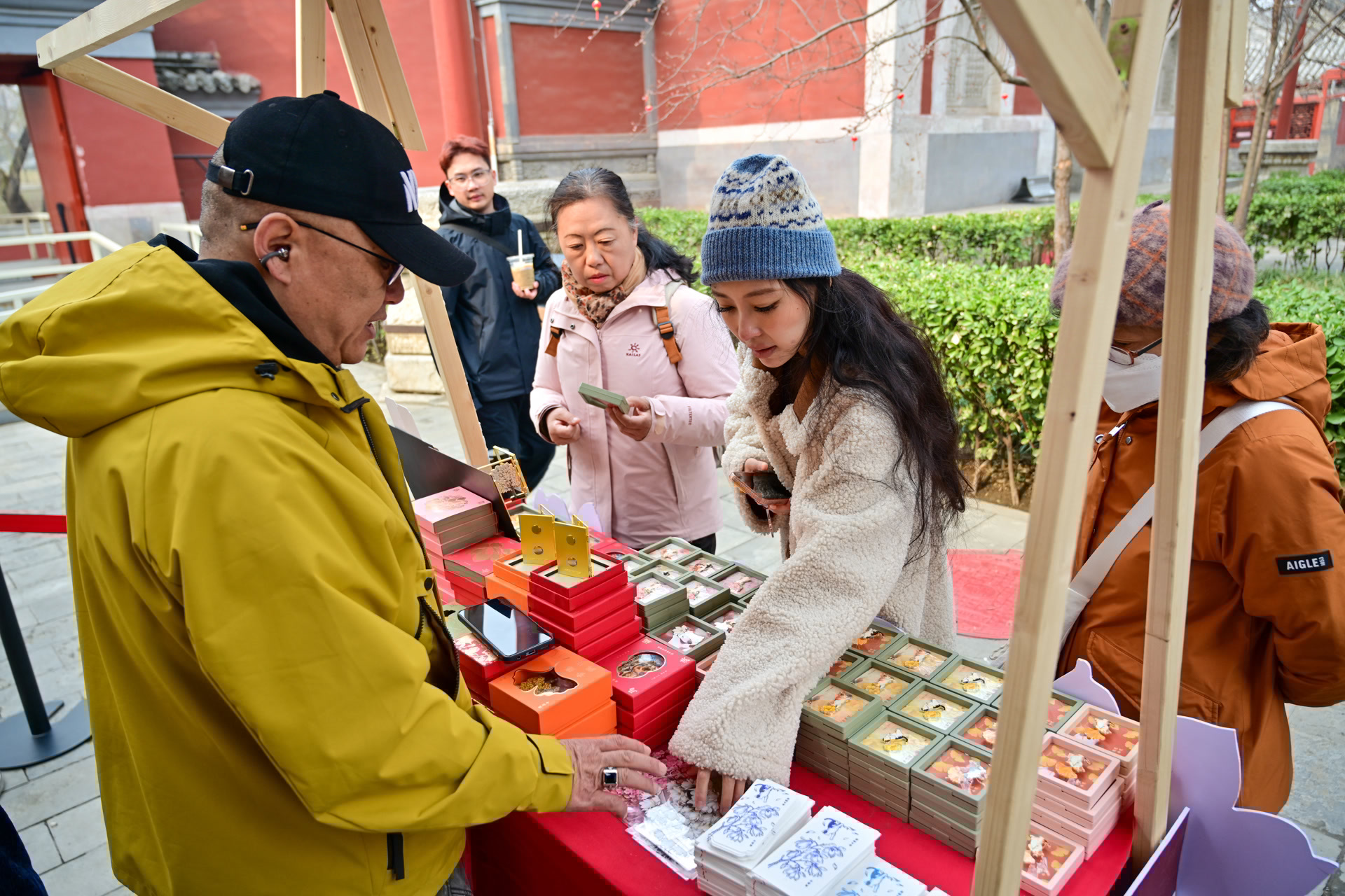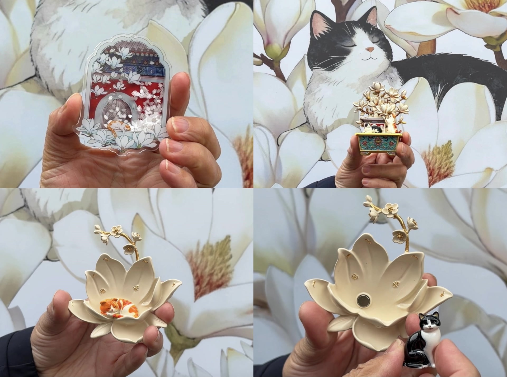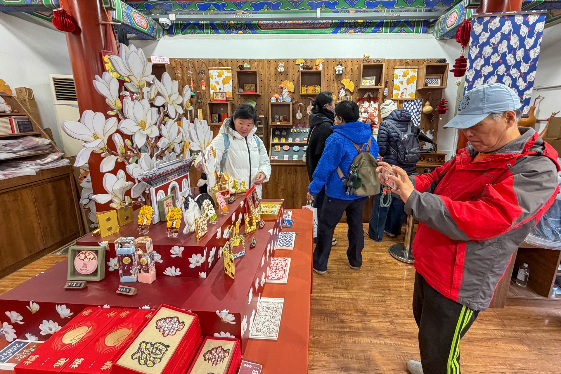 “这套‘金玉满堂’系列文创,灵感来源于万寿寺内栽植的7株玉兰和3株海棠,既取花名谐音,也寓意十全十美。”艺博业务部主任徐衍伟站在小铺旁,向观众讲述最受欢迎的一款文创幕后,“这对冰箱贴以玉兰花为造型,让馆宠猫咪糖糖和秀秀安稳地窝在花蕊里,更具治愈感。仔细看,花瓣上镶嵌着蝙蝠纹,把‘洪福齐天’的美好寓意藏在细节里。”