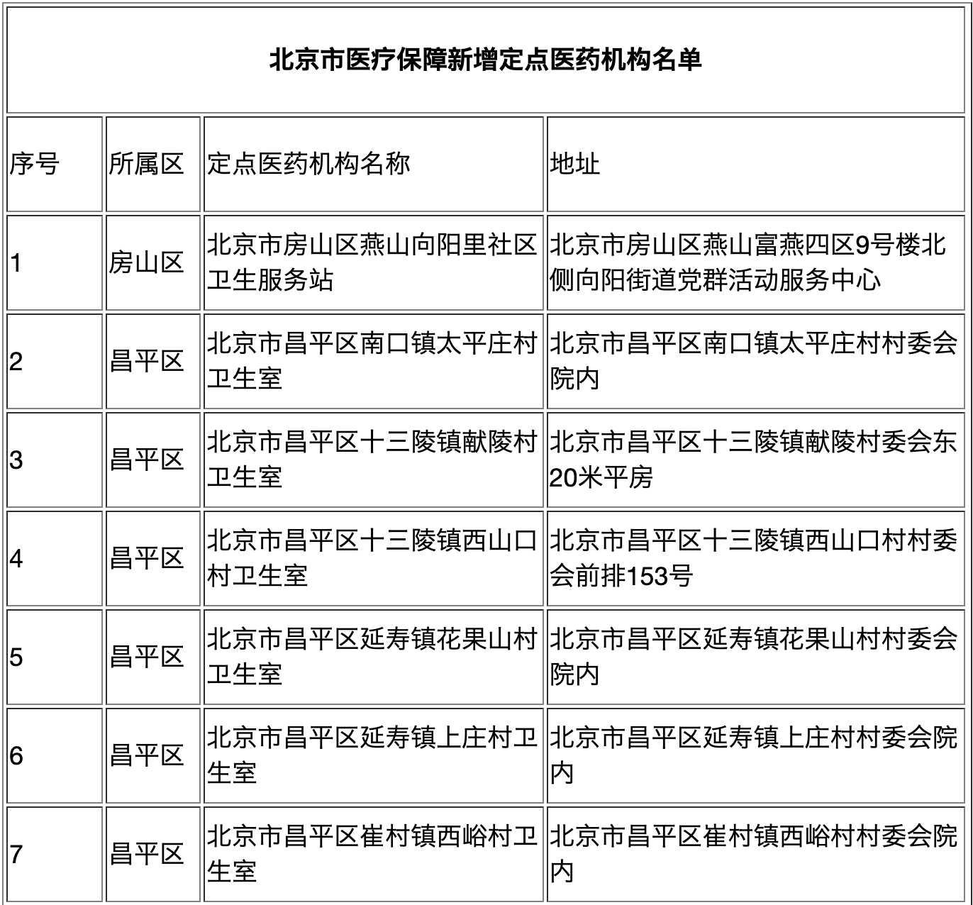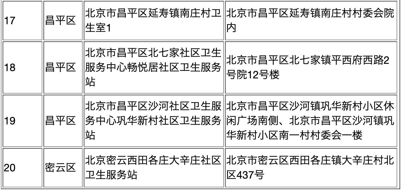 新增的20家定点医药机构中,昌平区共18家,房山区、密云区各有1家社区卫生服务站。同时,东城区北新桥街道北新桥社区卫生服务站、西城区天桥街道东经路社区卫生服务站两家定点医疗机构恢复医保服务。