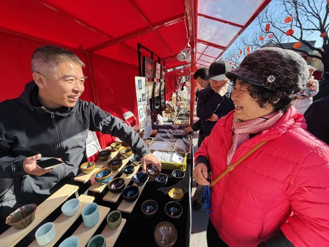 也有传统瓷器茶杯建盏。陈氏青瓷摊主陈师傅介绍,摊位的青瓷主要是中国唐宋时期的汝窑和龙泉。人生经验沉淀的丰富一点的人,相对喜欢青瓷,尤其是汝窑,因为这种瓷器1000多年的器型和釉色更符合中国传统的美学以及对人生的理解。“宛平城也是中国北方保存比较好的几个古城之一,我们也是奔着文化来的,在这里是古树、城楼、青瓷相映成章。”
