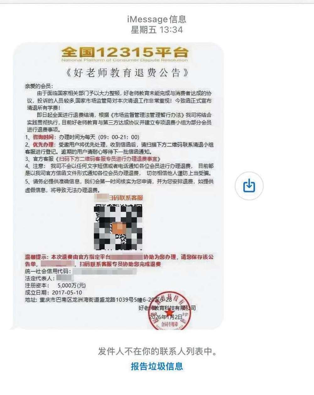 “由于面临国家相关部门予以大力整顿,由于鲸学伴未能完成与消费者达成的协议,投诉的人员较多,国家市场监管局对本次清退工作非常重视!今致函正式宣布清退所有学费!”近日,打着“全国12315平台”旗号的退费公告短信在多地扩散,时颖和崔涵正是在收到这类短信之后,陷入骗局之中。