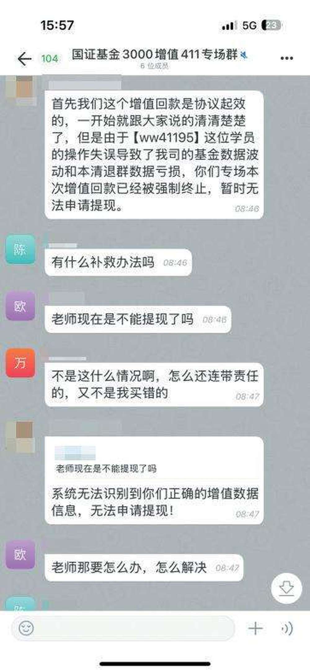 在对方表示“因为其他学员操作失误导致后台数据乱,需要再买8万+3万的阶梯式基金,群里的4位学员一起修复”后,其余“学员”都表现得非常焦急。“我当时也觉得11万太多了,但是看到别人已经付完款,自己如果不买会影响到所有人提现,就还是决定要继续做下去。”