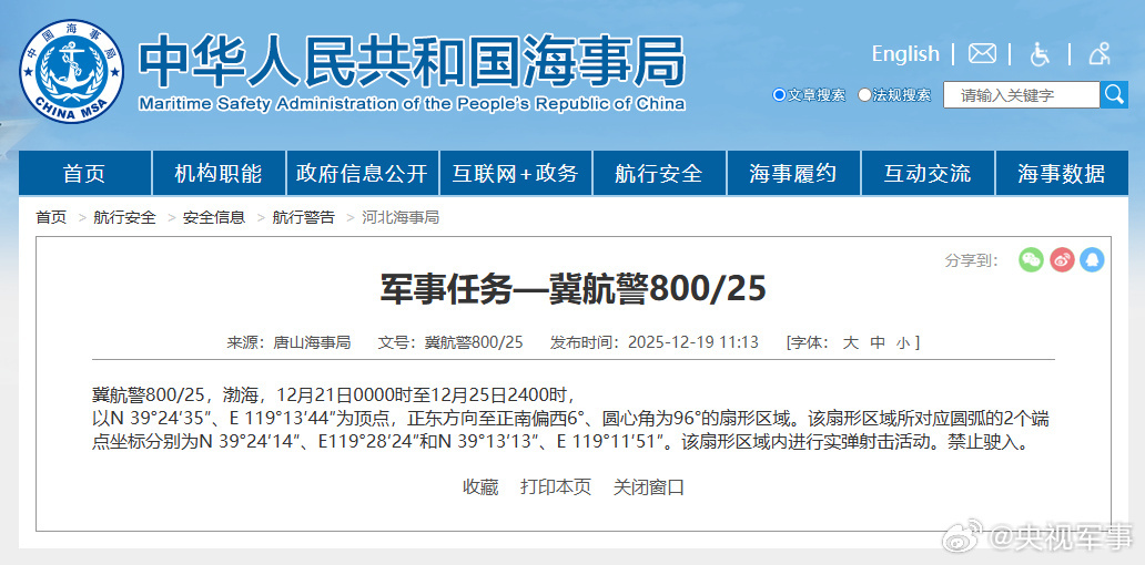 据中国海事局网站消息,唐山海事局发布航行警告,12月21日0时至12月25日24时,渤海部分海域进行实弹射击活动,禁止驶入。