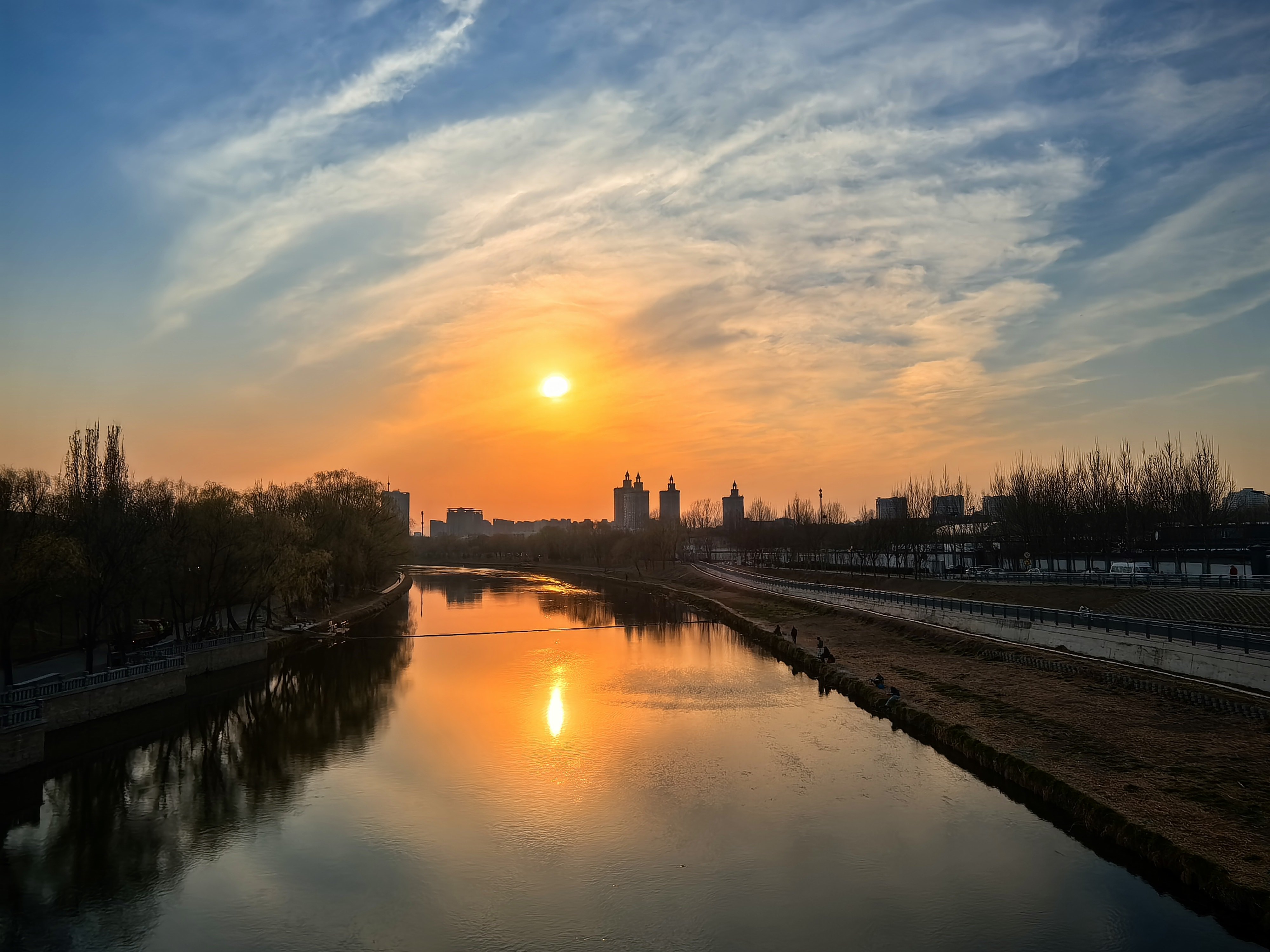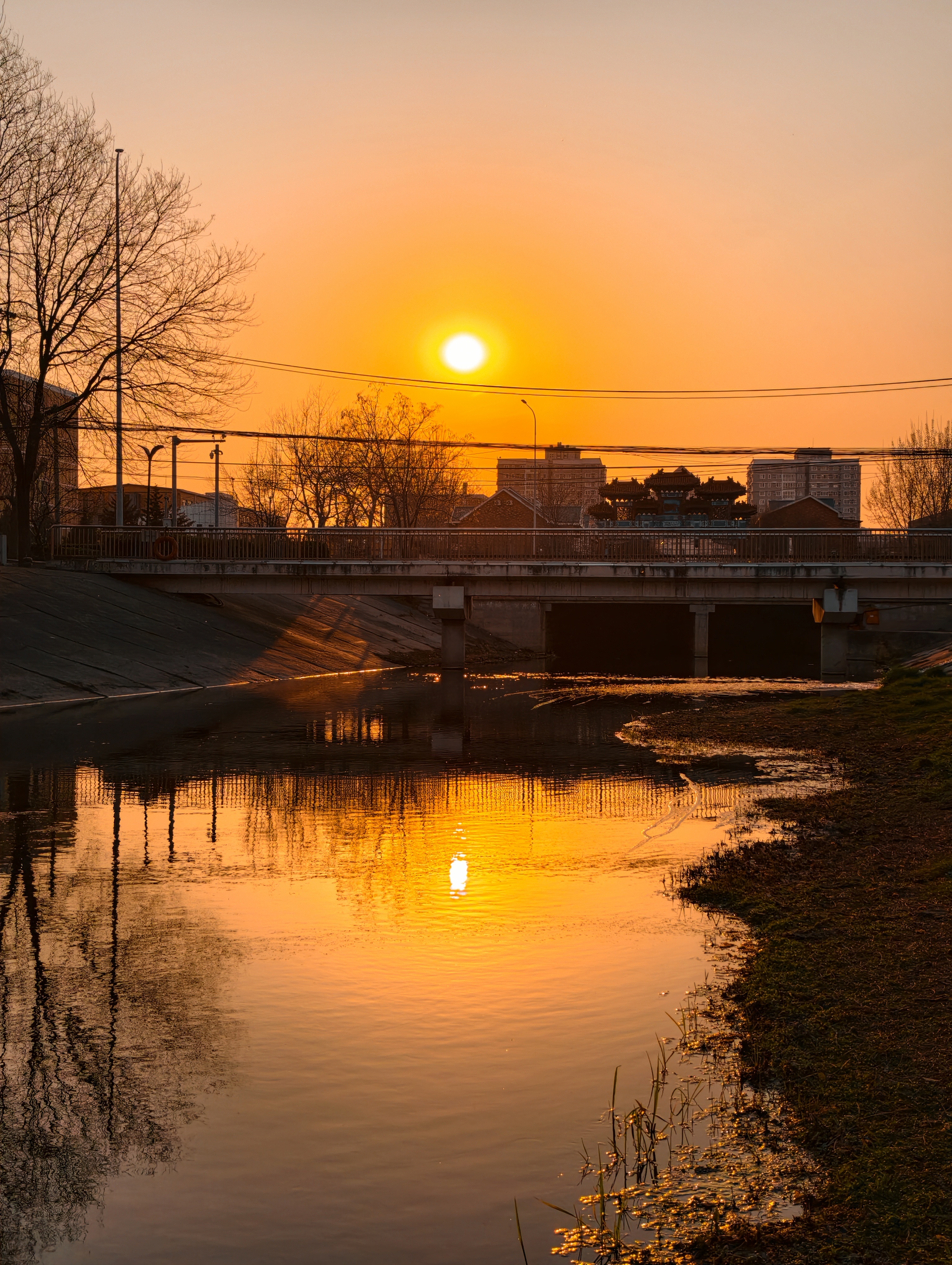 北京今天的落日把余晖轻轻铺在河湖之上,水波一漾,霞光便柔柔晕开,漫成一片温柔的暖金。