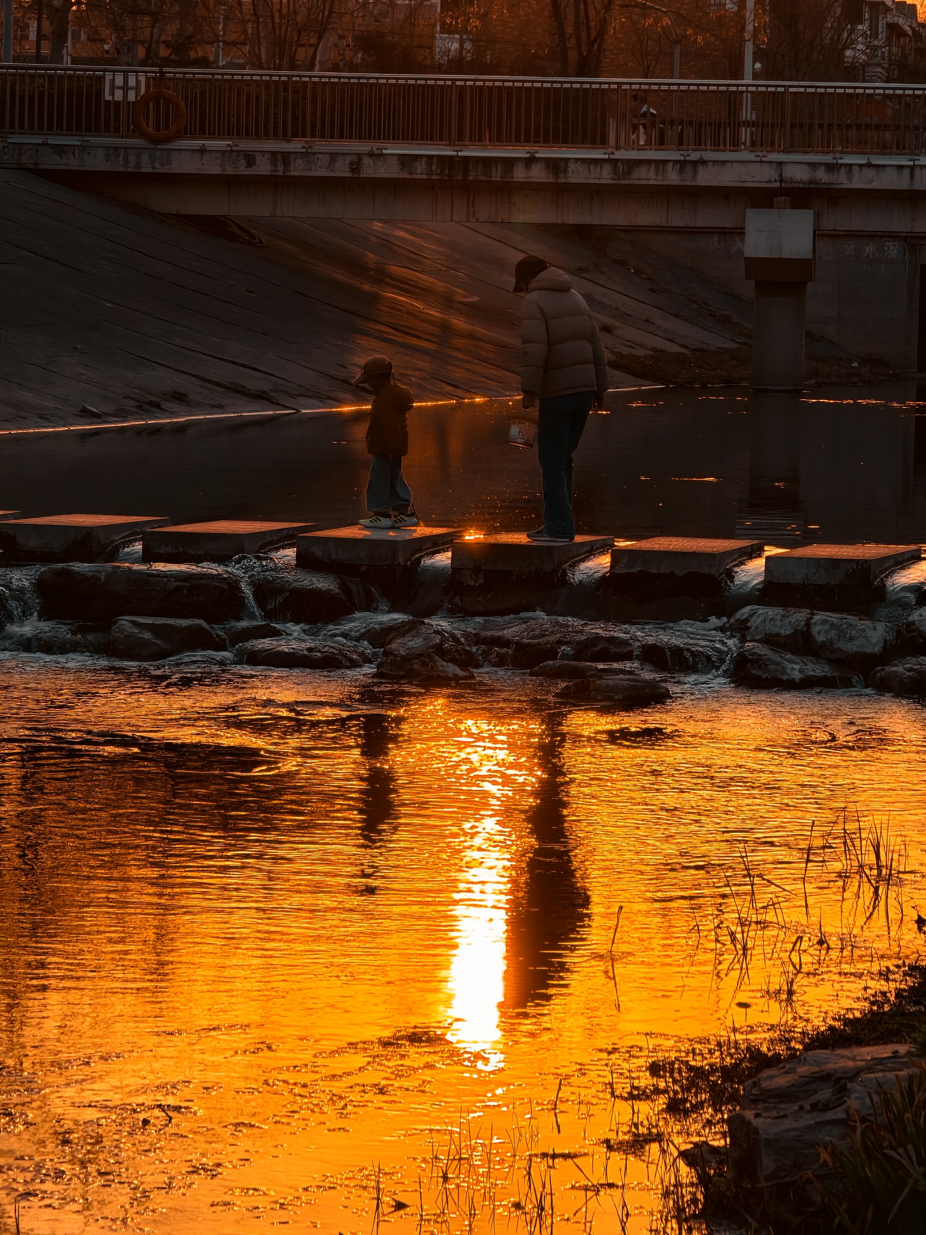 光影里,一对父子缓步走过水岸。夕阳裹着花香,凝着温润,连倒影都浸在融融的春意里,一景一人,一动一静,皆是暖暖的春意。