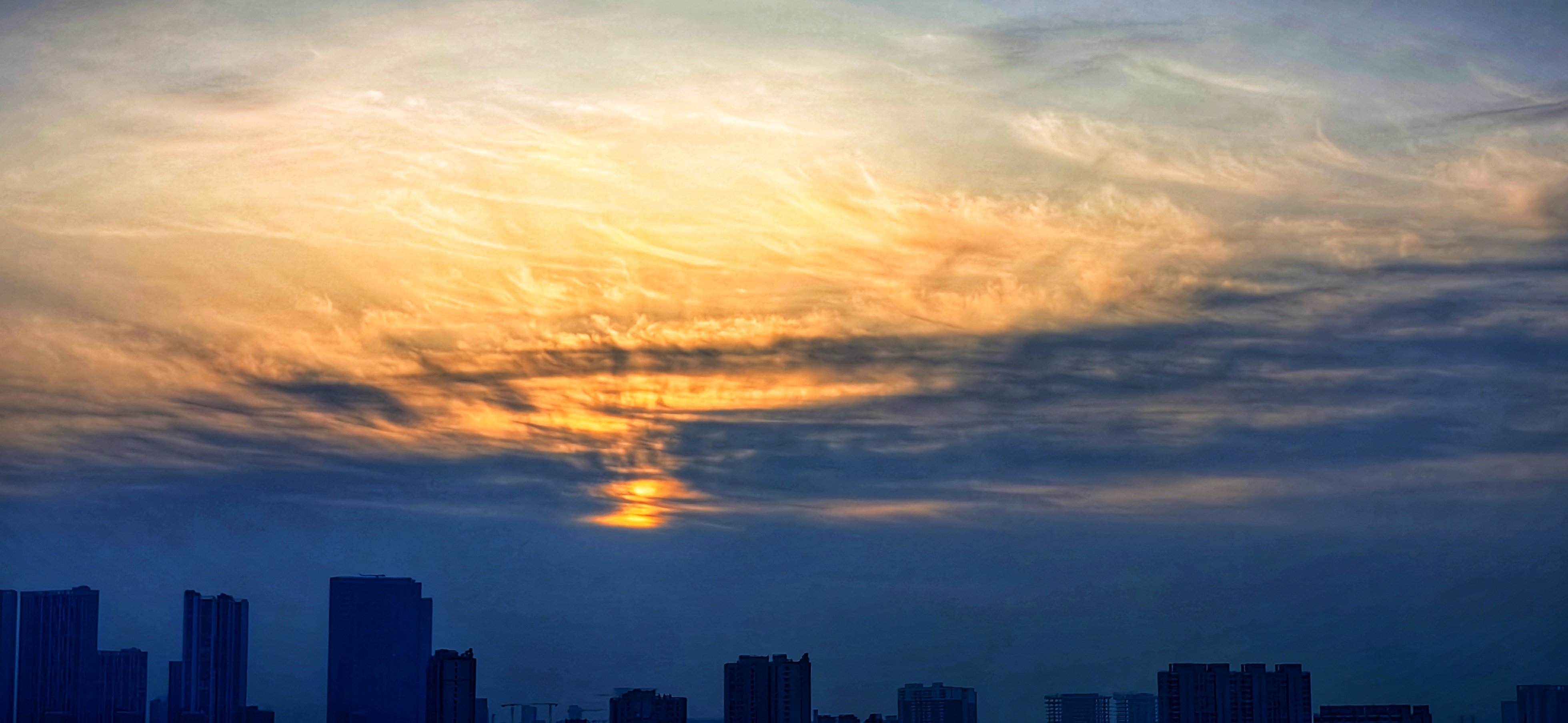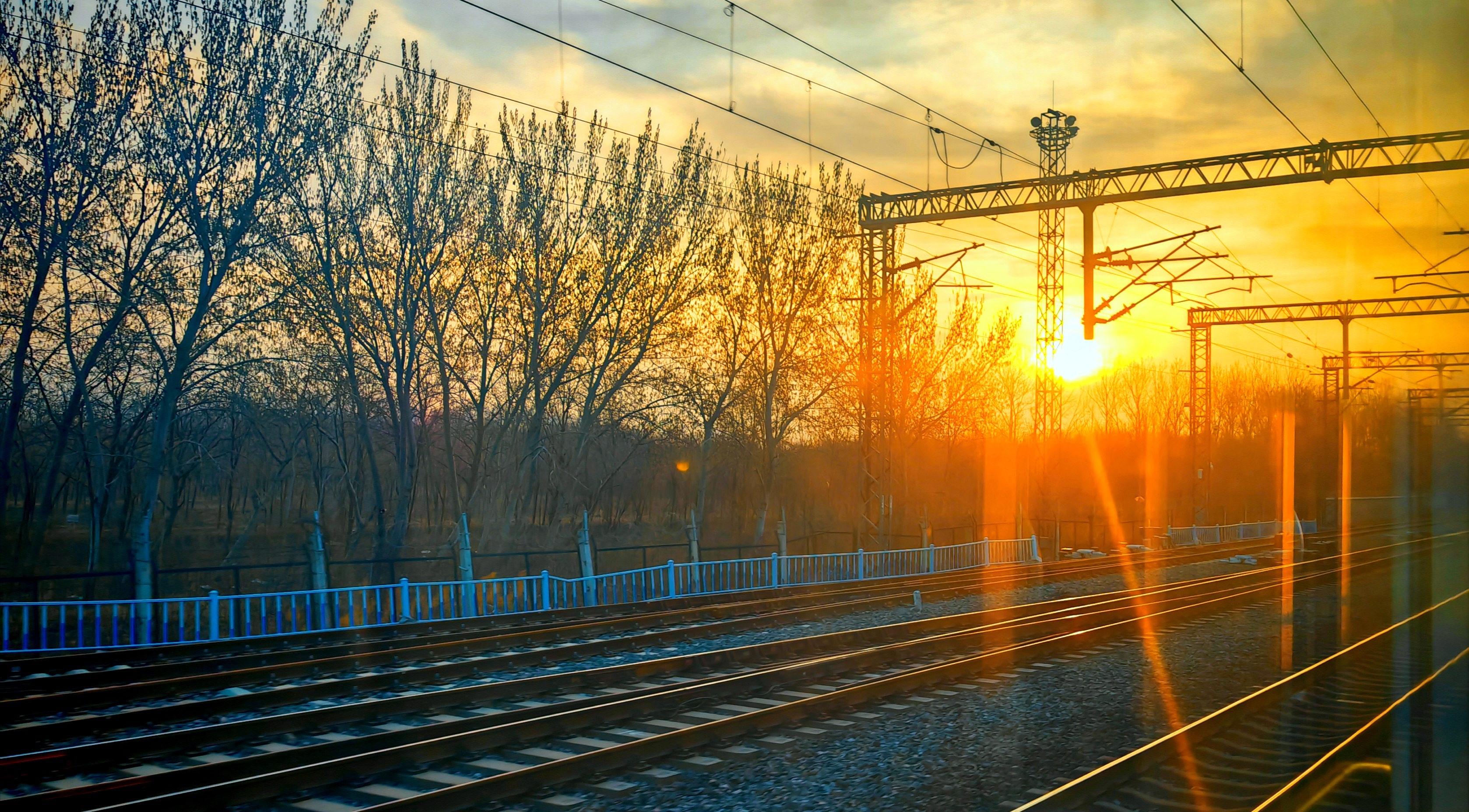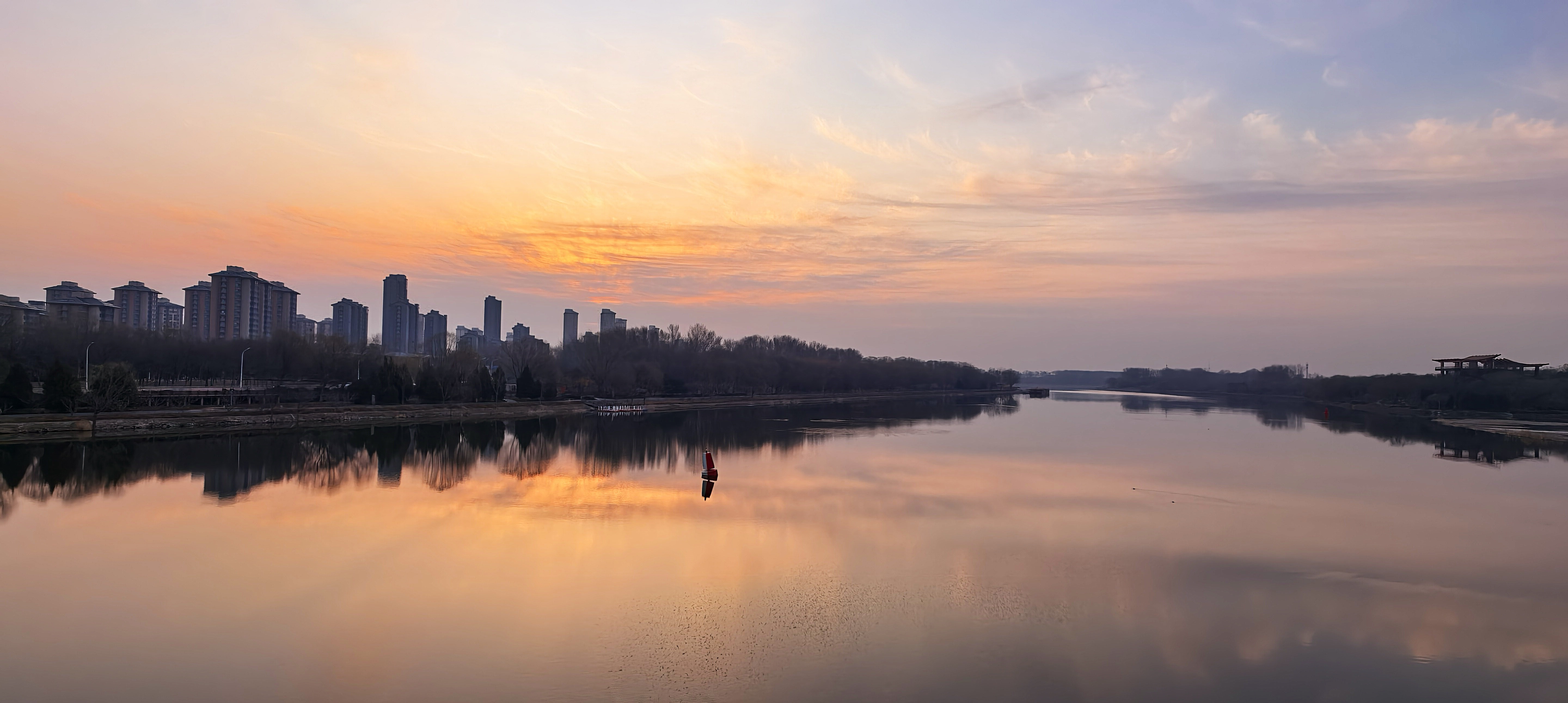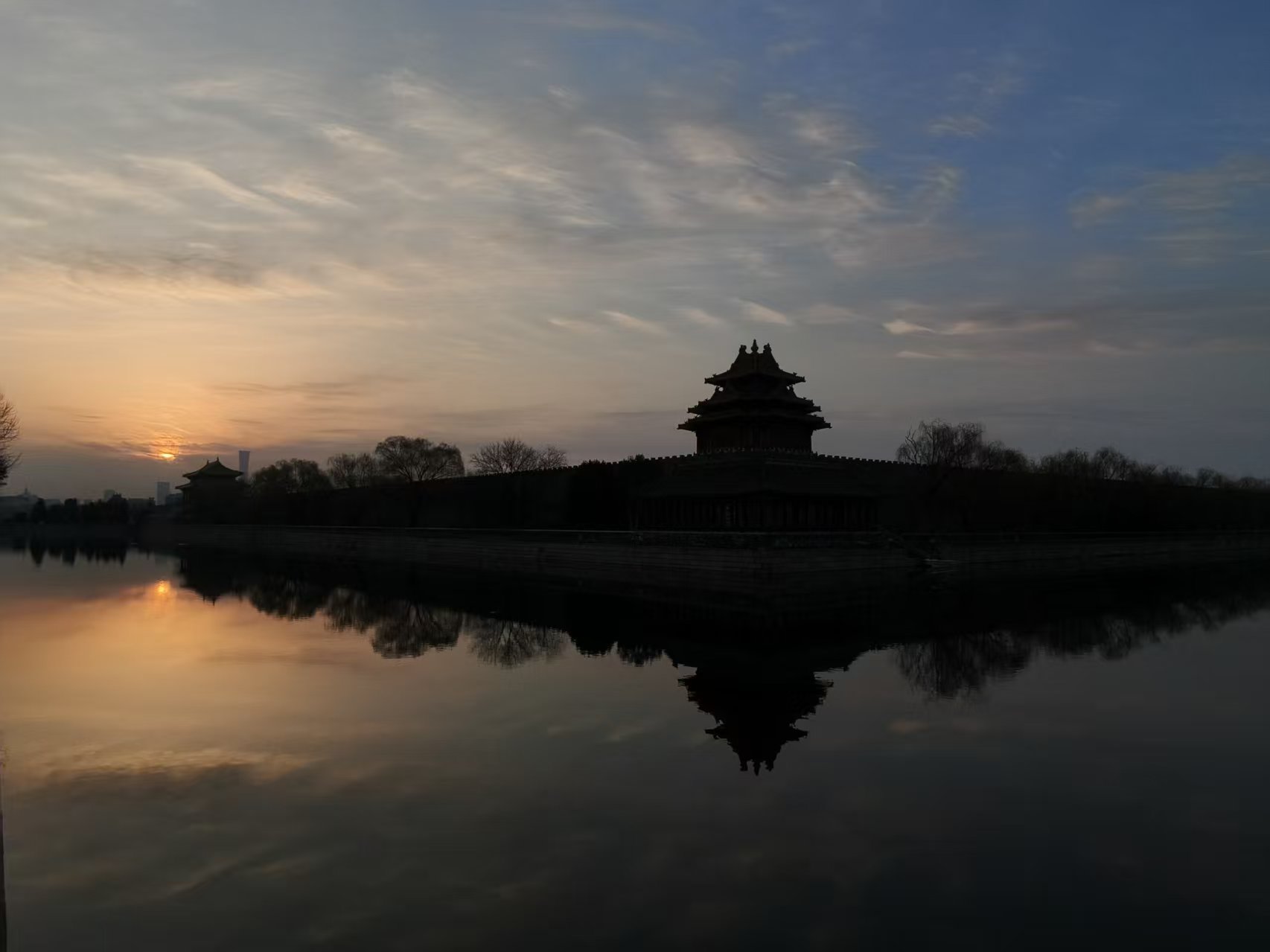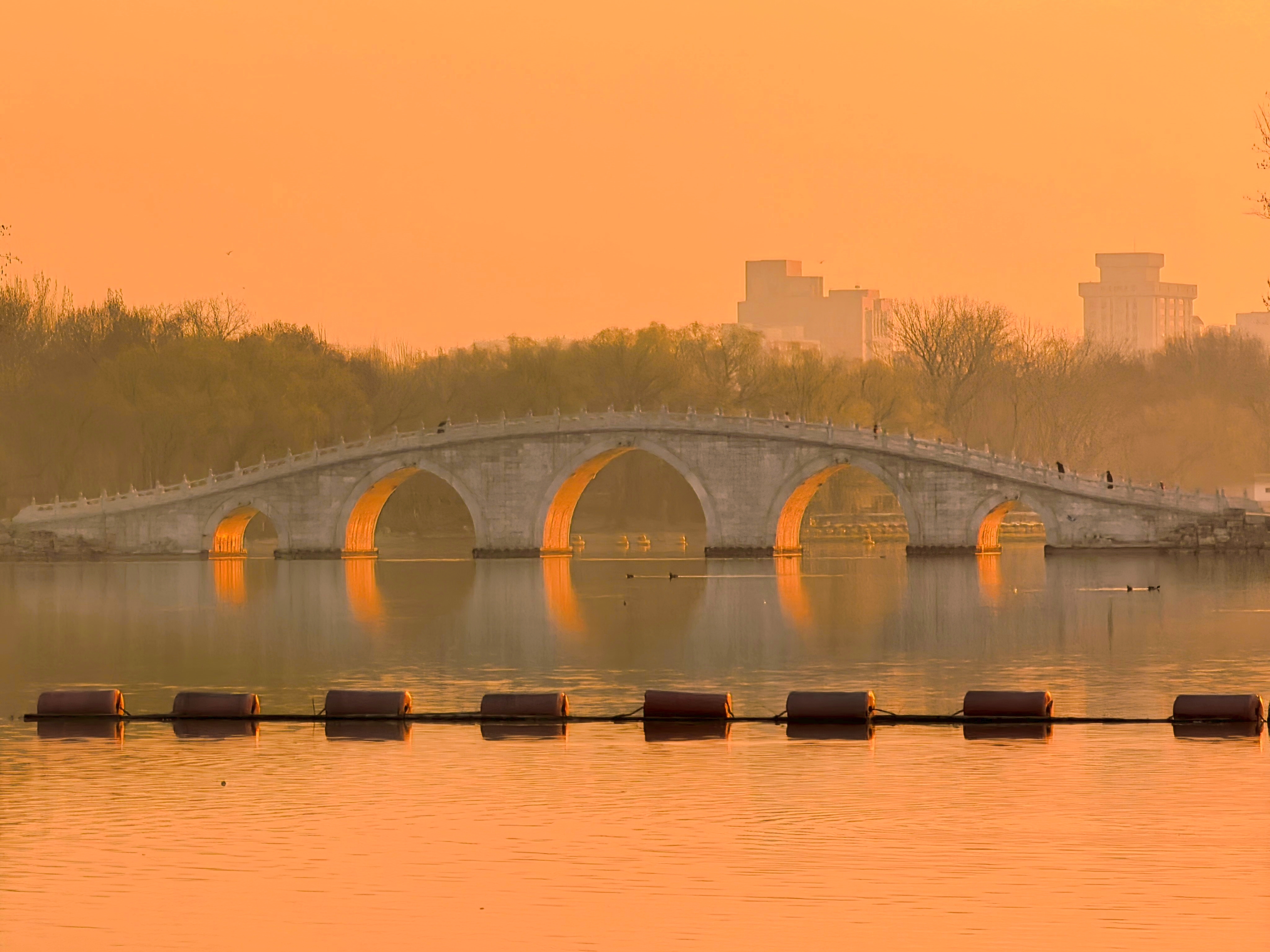 3月16日早晨,北京朝霞染红天际,北京玉渊潭公园中堤桥呈现瑰丽金光穿洞美景。