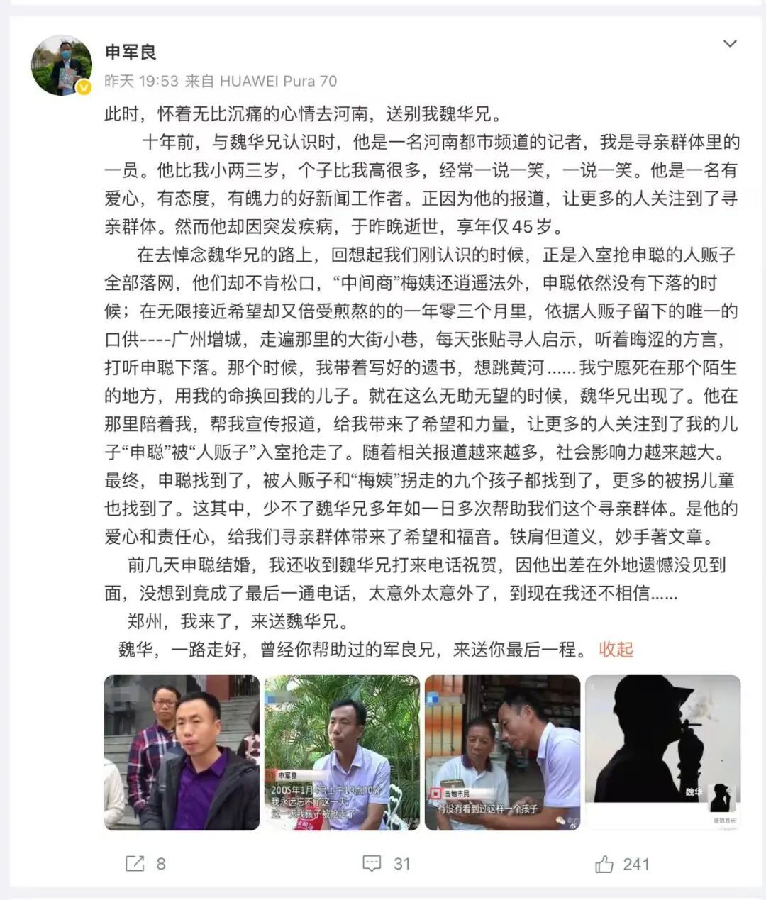 3月19日深夜,追踪“梅姨案”多年、持续推动寻亲线索扩散的河南广播电视台都市频道调查记者魏华,因心脏疾病不幸去世,这离他的45岁生日只有3天。