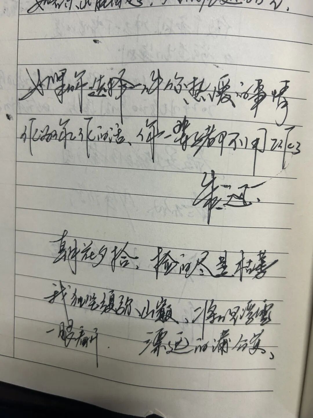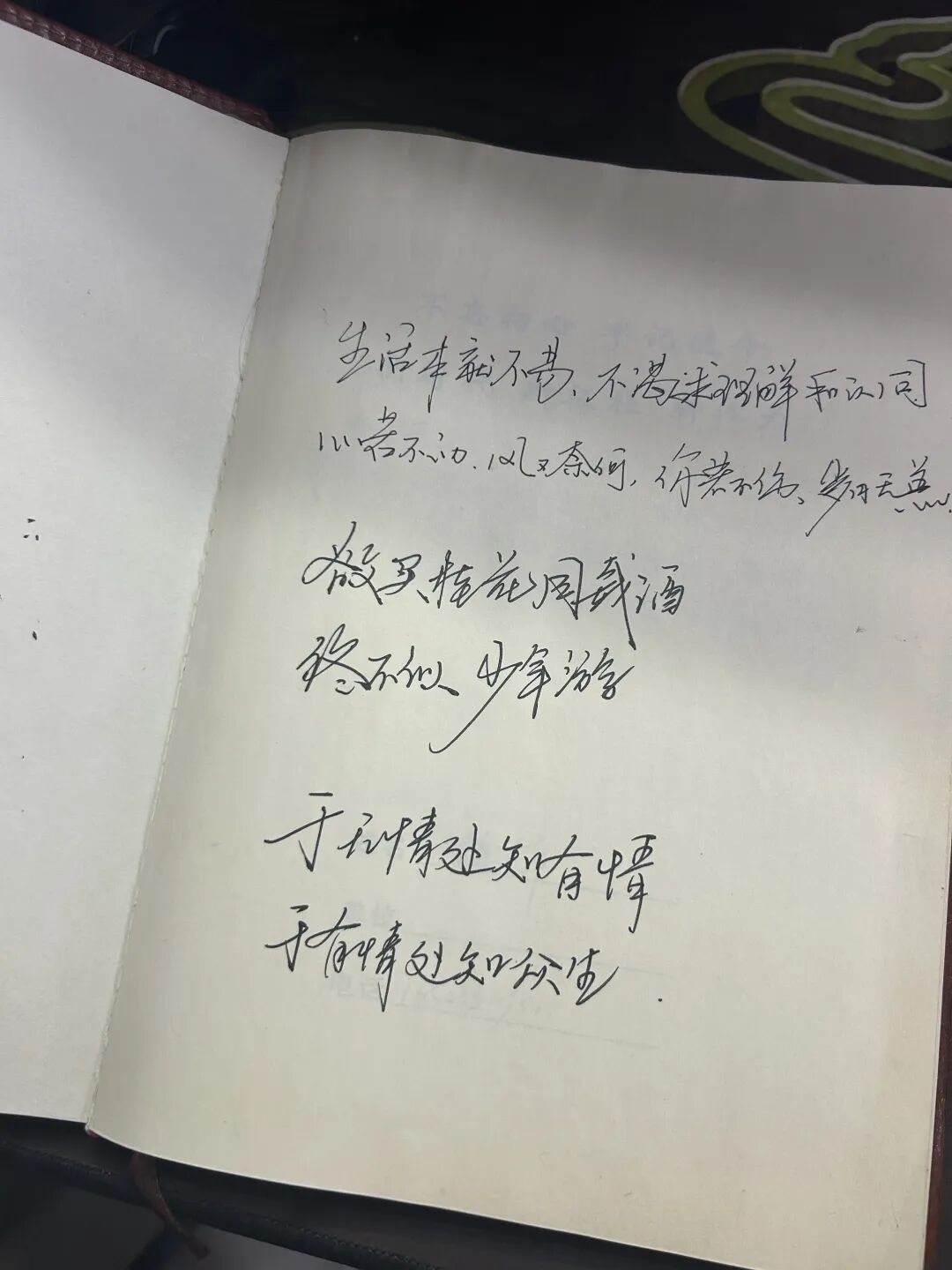 魏华走了,他的办公桌还保持着生前的模样,一本棕色封面的学习笔记静静摊放,页脚已被岁月磨得微卷。黑色笔迹写下的字句苍劲有力:“欲买桂花同载酒,终不似,少年游”,藏着对岁月的轻叹;“我的心里住着四季,唯独你常春”,透着未曾言说的柔软;“如果你选择热爱的事情作为工作,一辈子都不用工作了”,则道尽他对新闻事业的赤诚和执念。