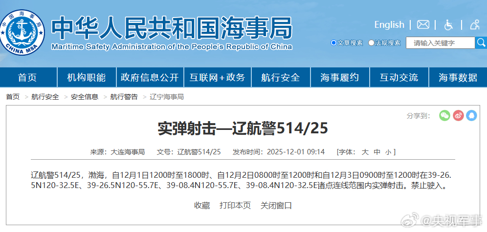 据中国海事局网站消息,大连海事局发布航行警告,12月1日12时至18时、12月2日8时至12时、12月3日9时至12时,渤海部分海域进行实弹射击,禁止驶入。