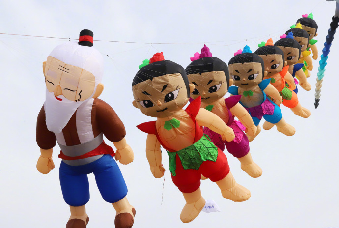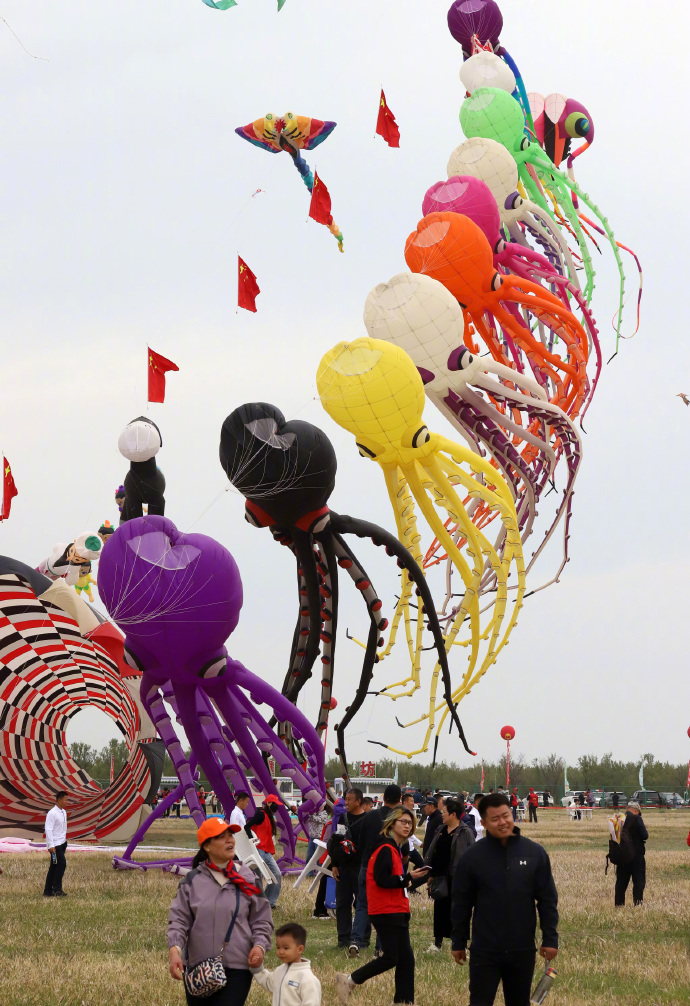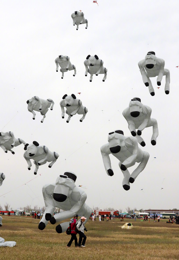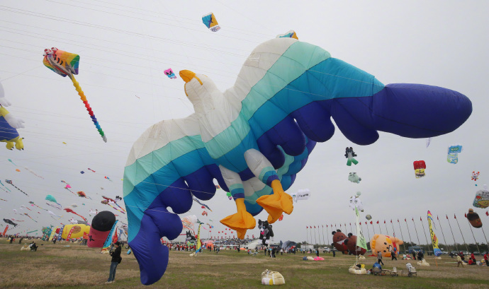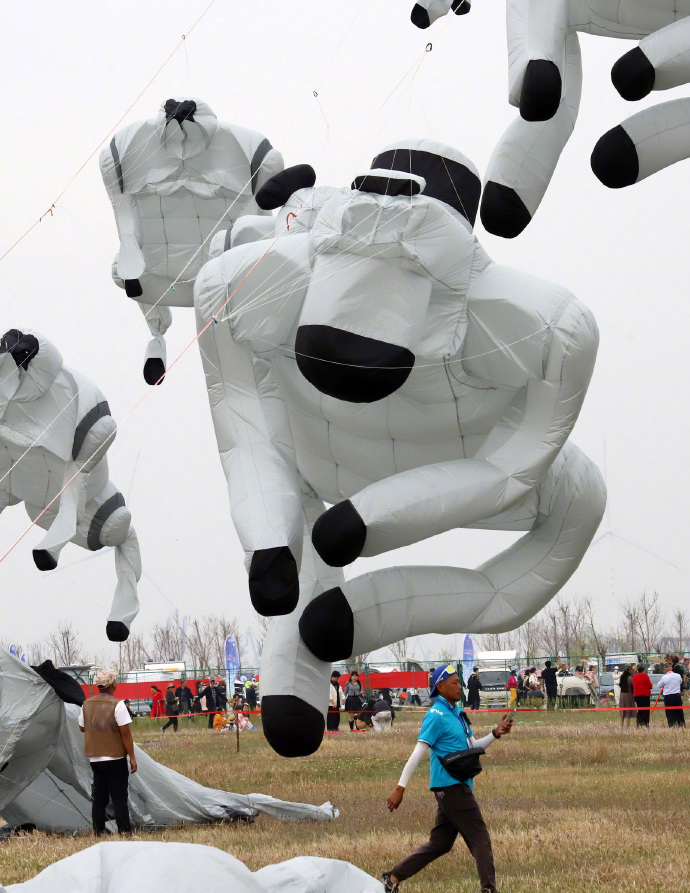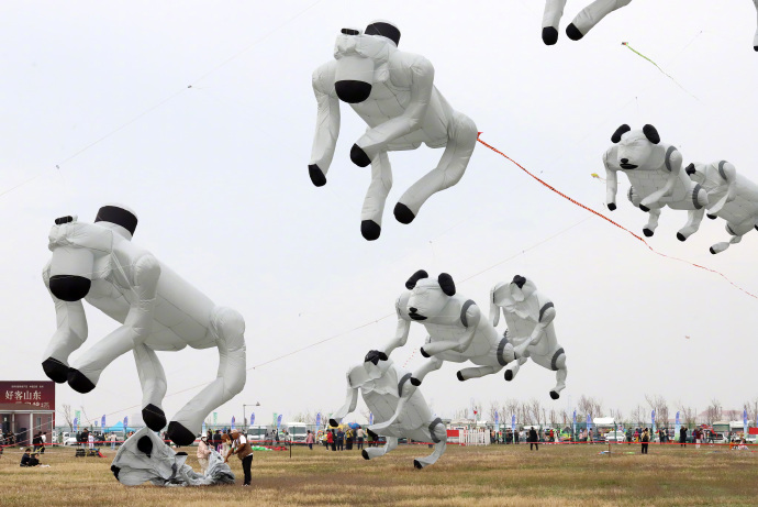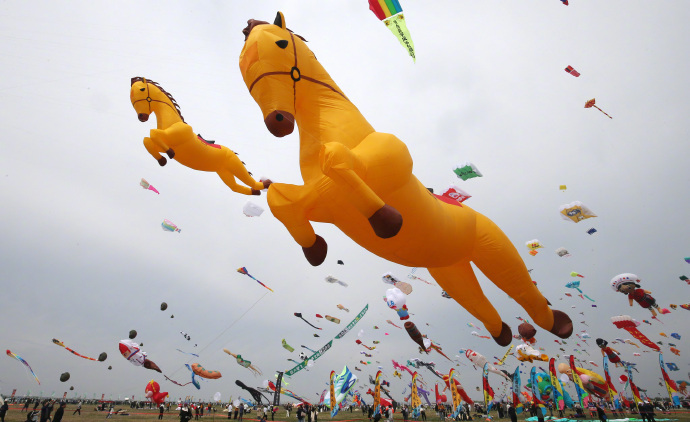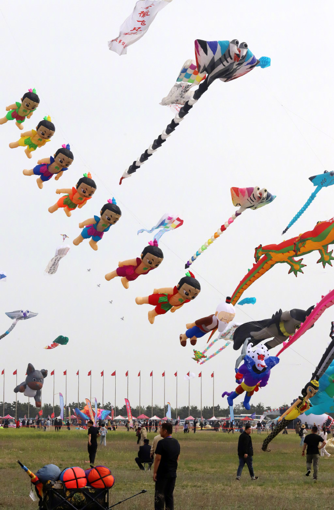 4月16日,山东潍坊举办第22届世界风筝锦标赛,各式各样的风筝迎风飞舞吸引了众人目光。
